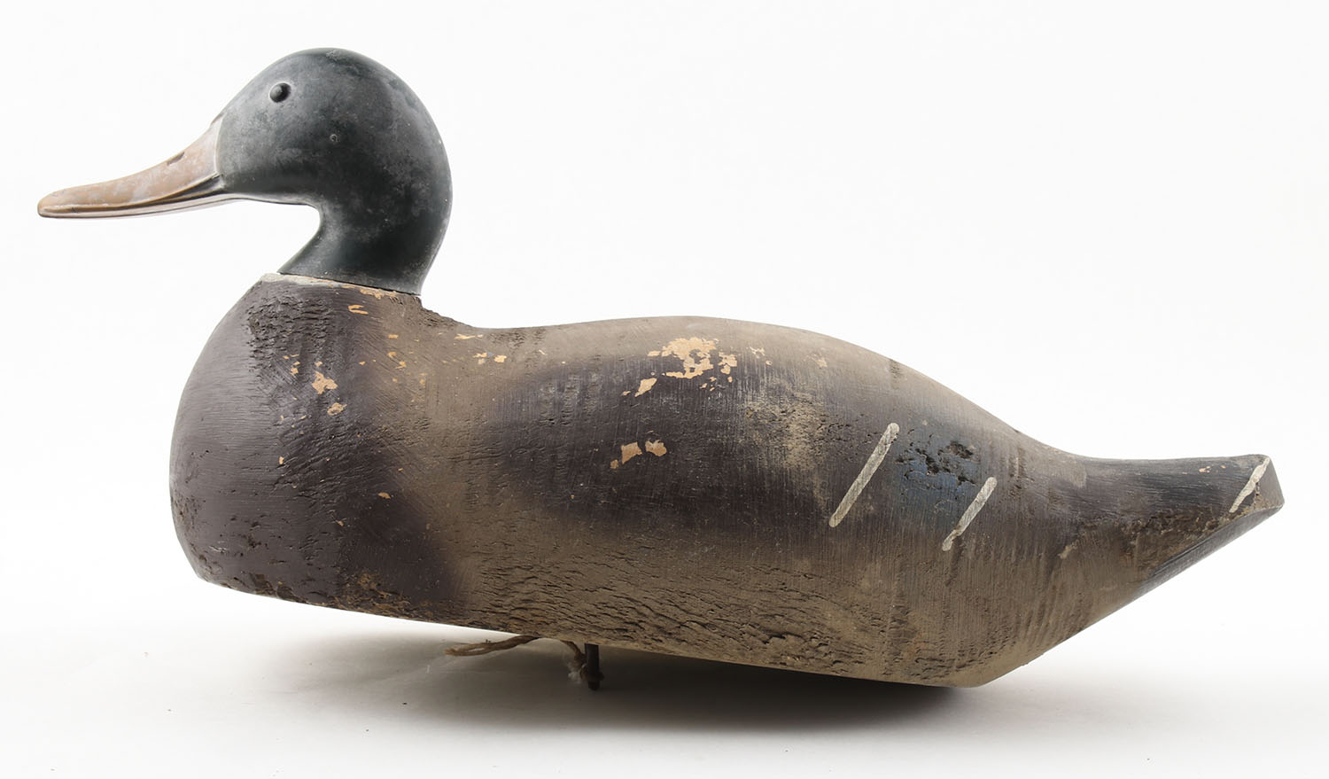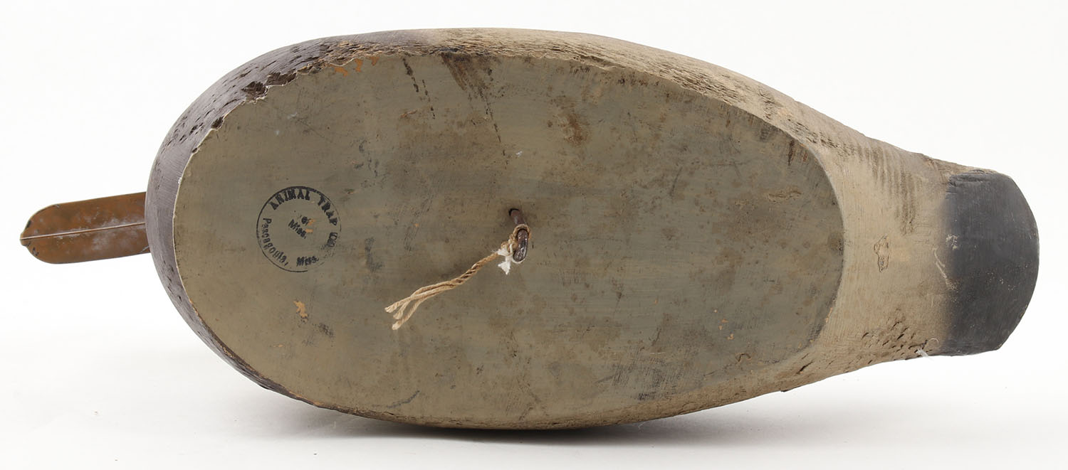 Mallard Drake by Animal Trap Co. Mississippi, raised painted eyes, solid wood body, original paint, plastic head, structurally excellent, marked on bottom, 15 1/2'' OAL. Grade: Very Good - Value: 20 to 40