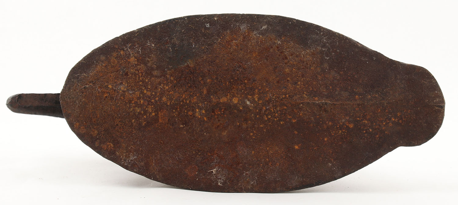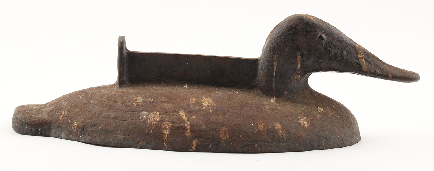 Weighted Decoy for Sink Boat, originally a weighted decoy for a sink boat, this decoy has had a piece of metal welded to the top to be used as a boot scraper, weighs 20 lbs, 15'' OAL. Grade: Good - Value: 10 to 50