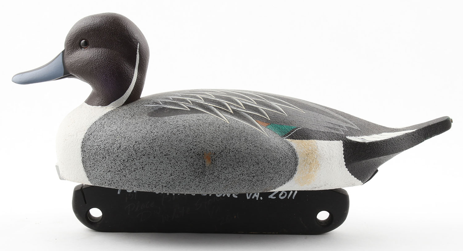Pintail Drake by Unknown Maker, White Stone, VA, 2011, glass eyes, solid foam body, original paint, structurally excellent, 15 1/2'' OAL. Grade: Excellent - Value: 10 to 30