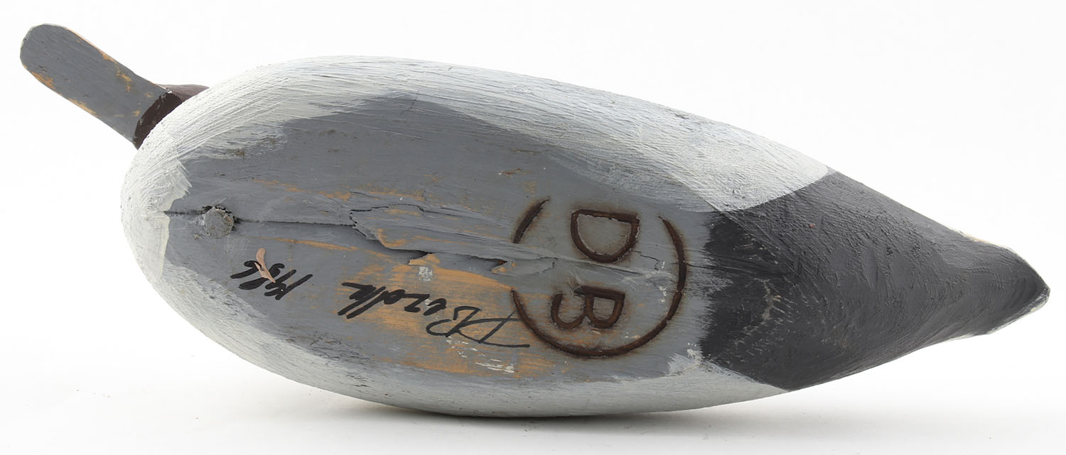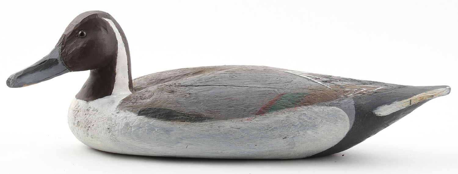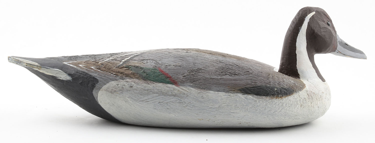Pintail Drake by DB, 1986, glass eyes, solid wood, original paint, structurally excellent, 17'' OAL. Grade: Excellent - Value: 20 to 40
