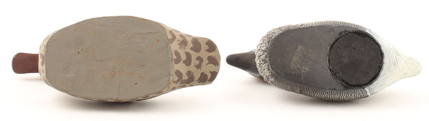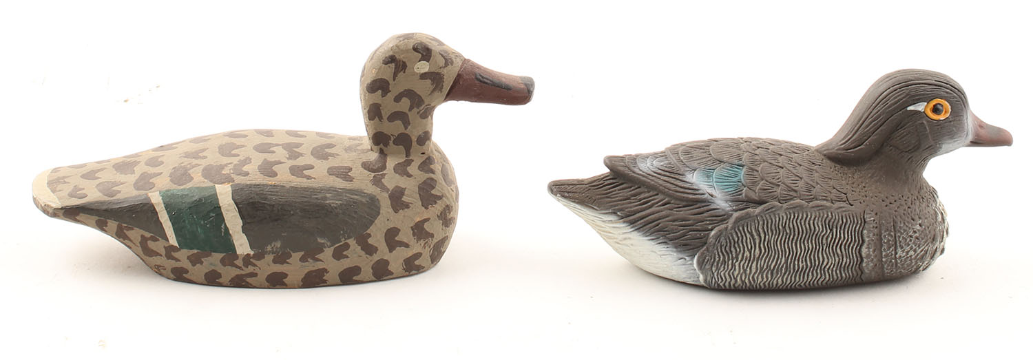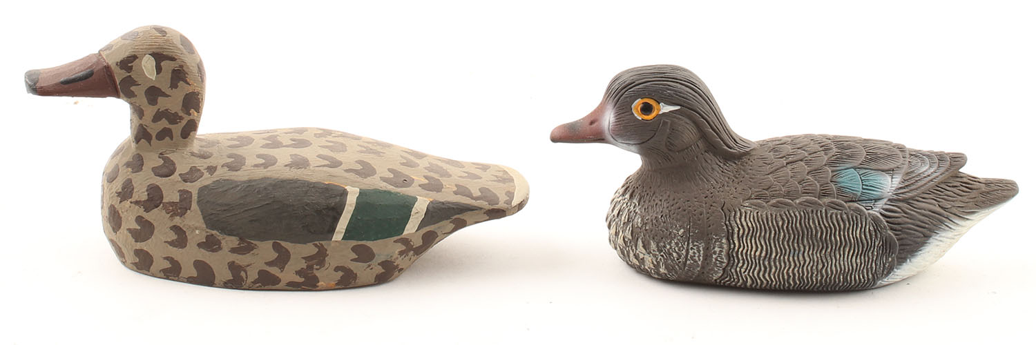 Pair of Salesman Sample Mallard Hen & Woodduck Hen, by Sport Plast or Carry Lite, painted eyes, wood & hard rubber, original paint, 5'' each. Grade: Very Good - Value: 20 to 60