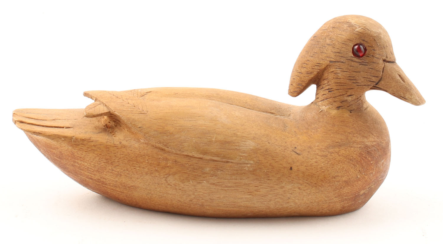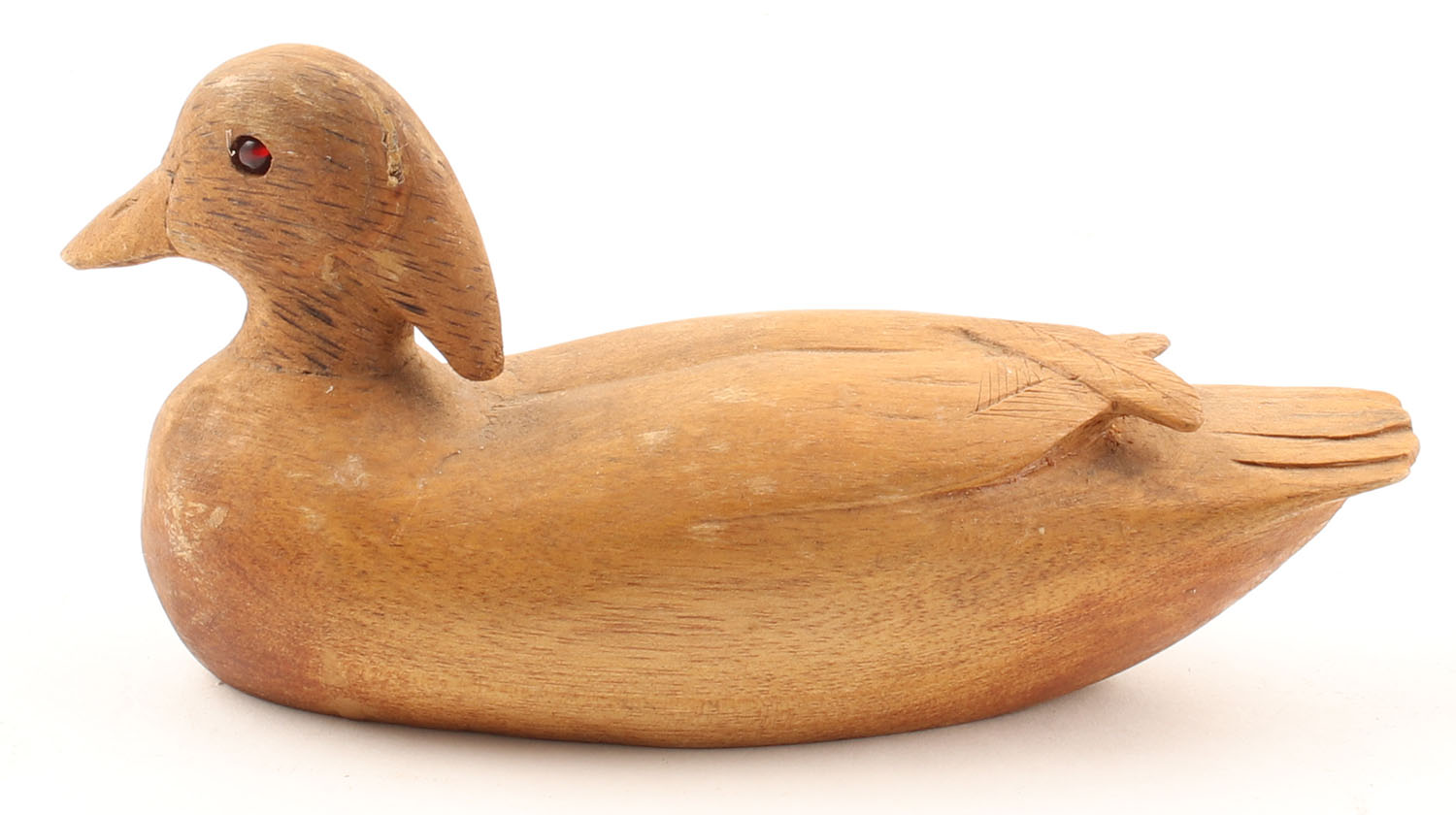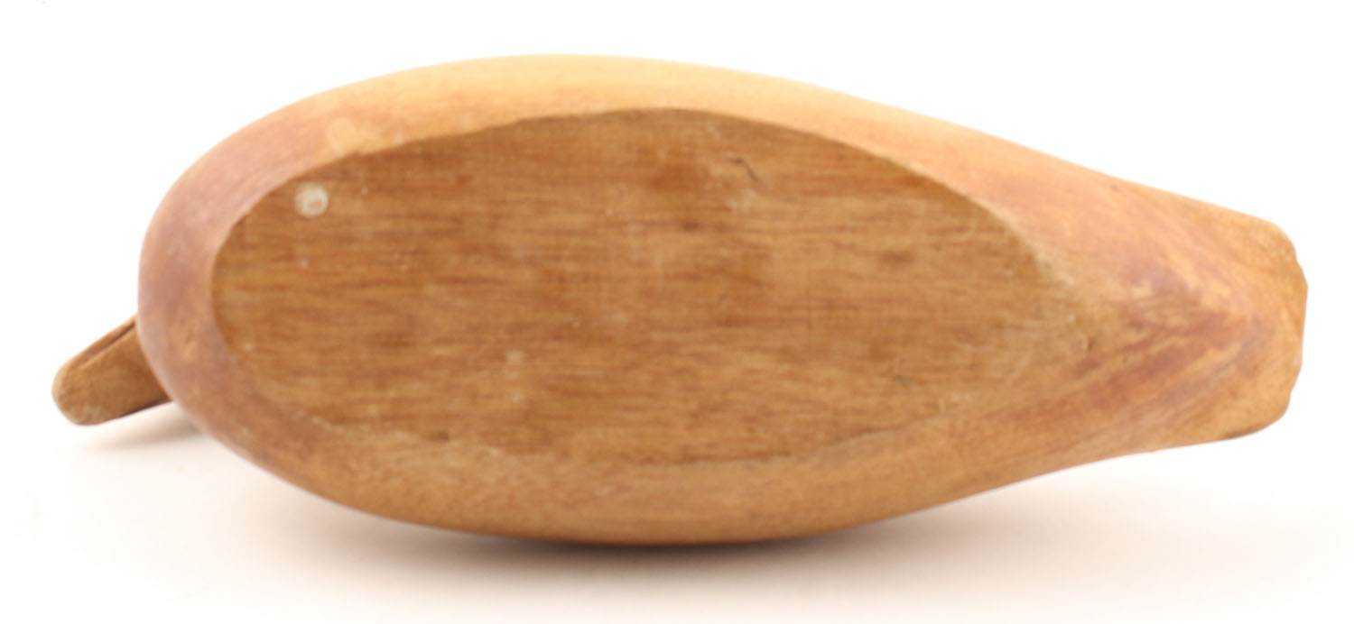 Miniature Woodduck Decoy by Unknown Maker glass eyes, solid wood, no paint, structurally excellent, 6'' OAL. Grade: Excellent - Value: 10 to 30