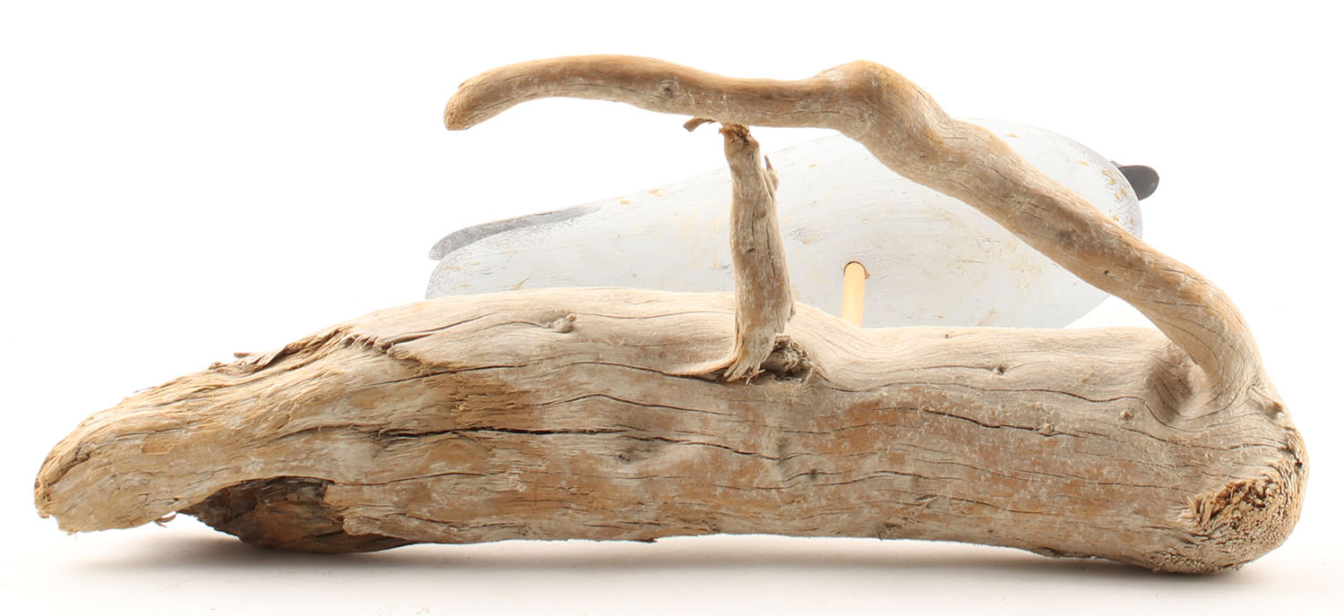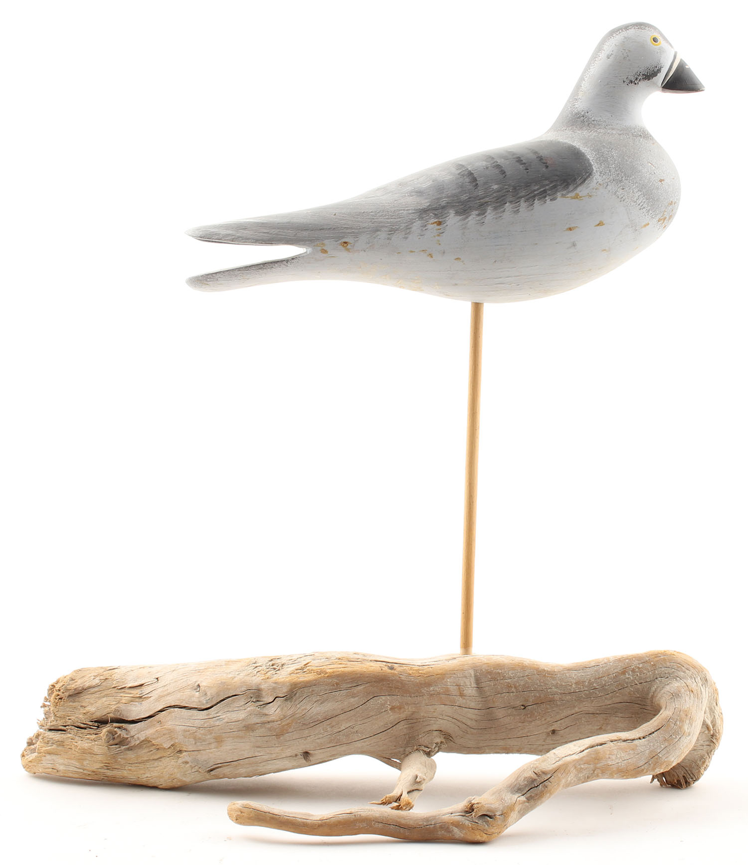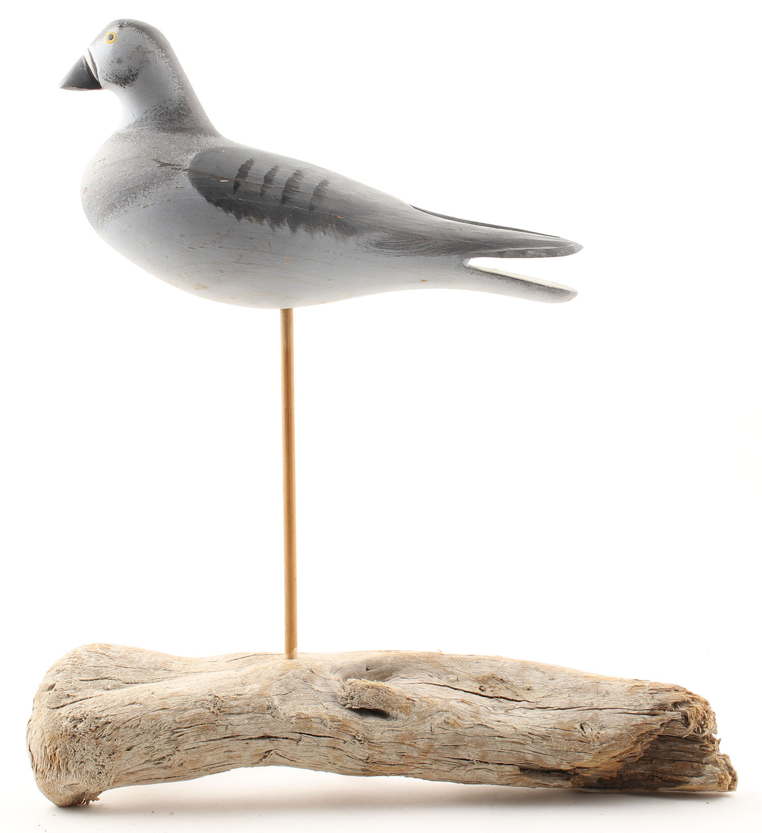 Dove Decoy by Unknown Maker, painted eyes, solid wood, original paint, structurally excellent, comes with habitat log & post, 14'' x 16''. Grade: Excellent - Value: 20 to 60