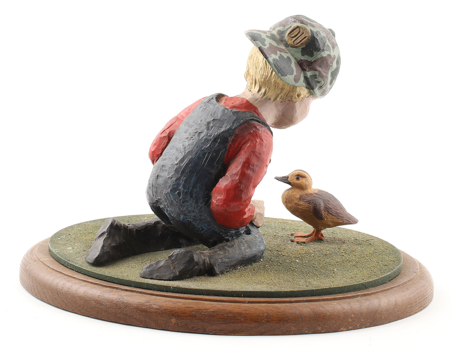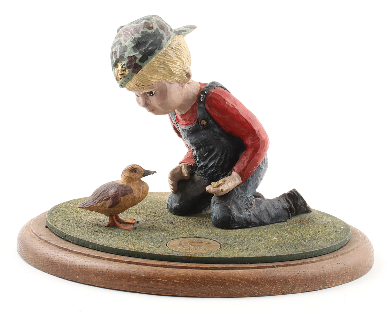 Ducks Unlimited Statue, features a boy on his knees feeding a duck, wood construction, original paint, DU coin, structurally excellent, 11'' x 8''. Grade: Excellent - Value: 10 to 60
