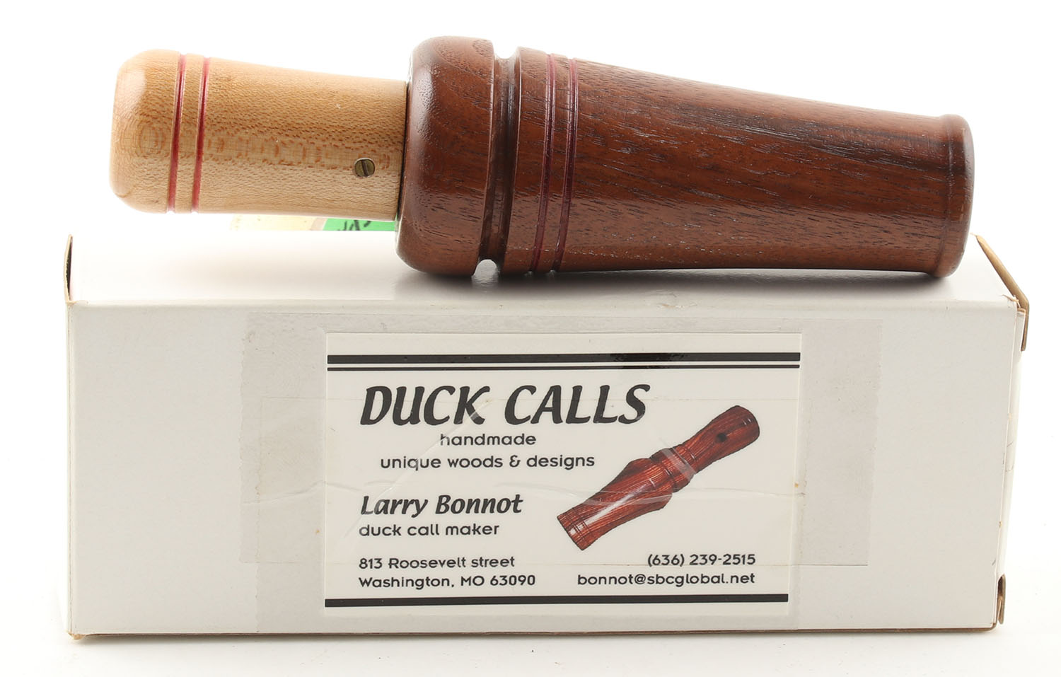 BOXED, Larry M. Bonnot Duck Call, Washington, MO, 2002, #17, marked on top of barrel & under reed, walnut & maple, plastic reed, Teflon liner in stopper, birch soundboard, 6'' OAL. Grade: Excellent++ - Value: 80 to 150
