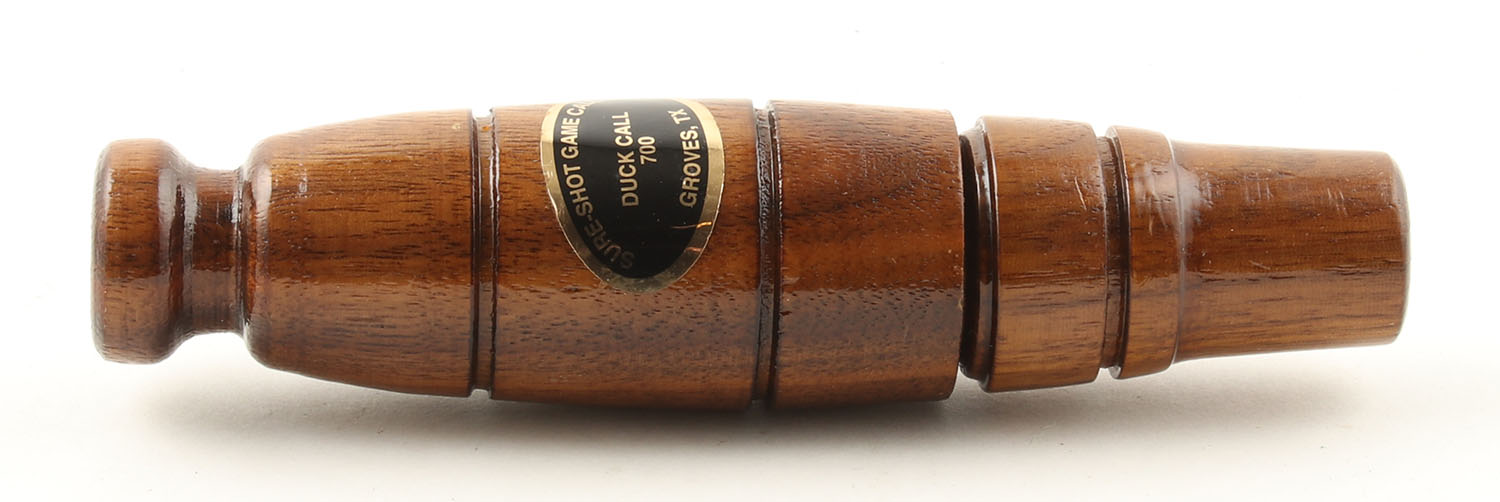 Sure Shot Game Calls Duck Call 700, Groves, TX, marked with sticker on barrel, one-piece, plastic reed, 5 1/2'' OAL. Grade: Excellent - Value: 10 to 60