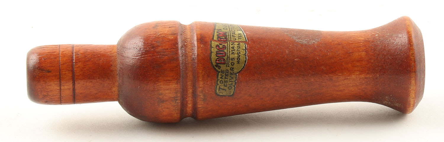 Oliveros Mfg. Co, DUC-EM, Tone Tested Duck Call, Houston, TX, marked on barrel, copper reed, 5'' OAL, some light wear from use. Grade: Excellent - Value: 20 to 60