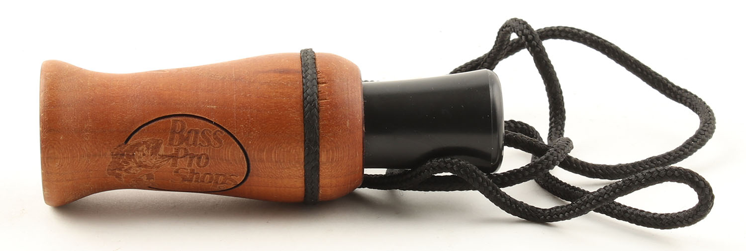 Bass Pro Shops Duck Call, marked on barrel, plastic reed, has lanyard, 4 1/4'' OAL. Grade: Excellent - Value: 4 to 40