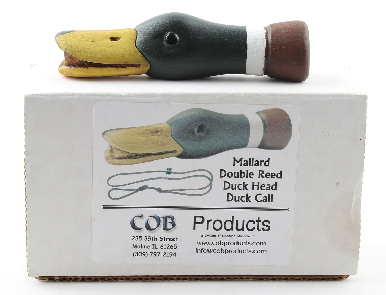 BOXED, C.O.B Products Mallard Double Reed Duck Head Duck Call, Moline, IL, marked with sticker on bottom of beak, one-piece, plastic reed, 5'' OAL, comes in factory box, with lanyard, packaging & paperwork. Grade: MINT - Value: 40 to 120