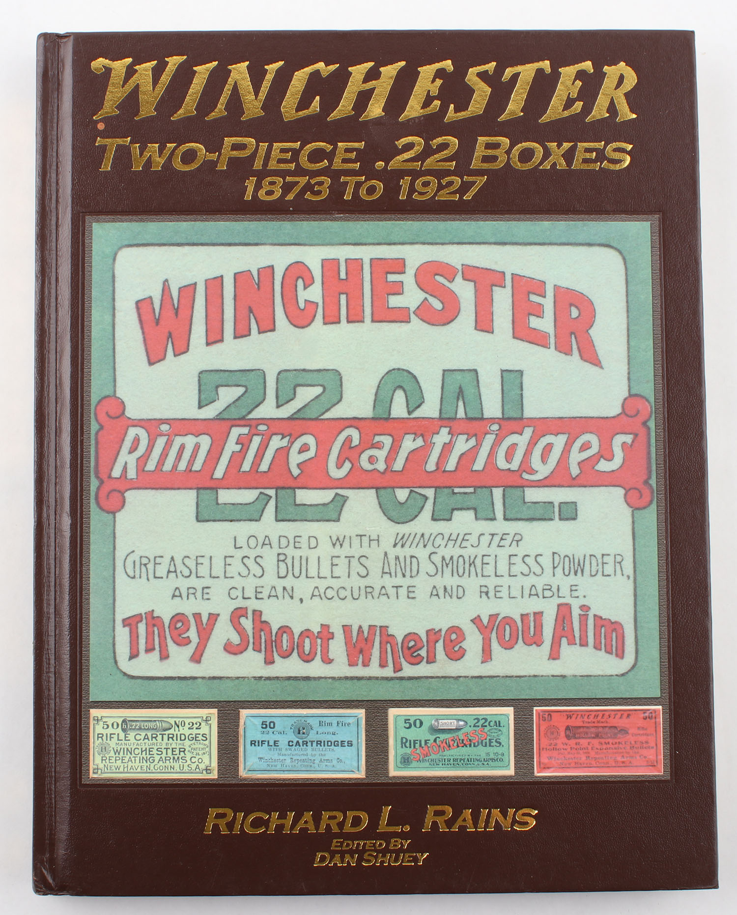 Winchester Two-Piece .22 Boxes 1873-1927 by Richard L. Rains 2006, 8 1/2'' x 11''. 212 pages, pages clean, binding tight, hardcover is mint, a must have for any .22 box collector. Value: $80 Grade: MINT - Value: 30 to 100