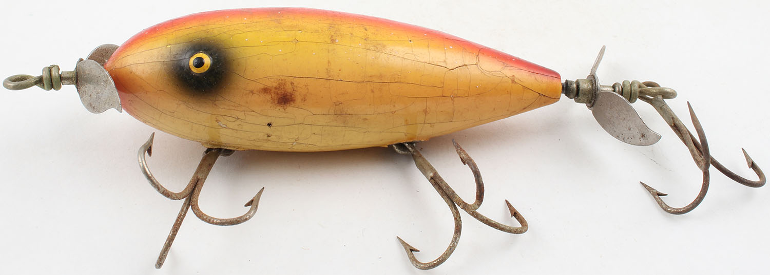 RARE Unmarked yellow & red 3 hook lure, TE, two spinners, some light crazing, body is 3 5/8''. Grade: Very Good ++ - Value: 30 to 200