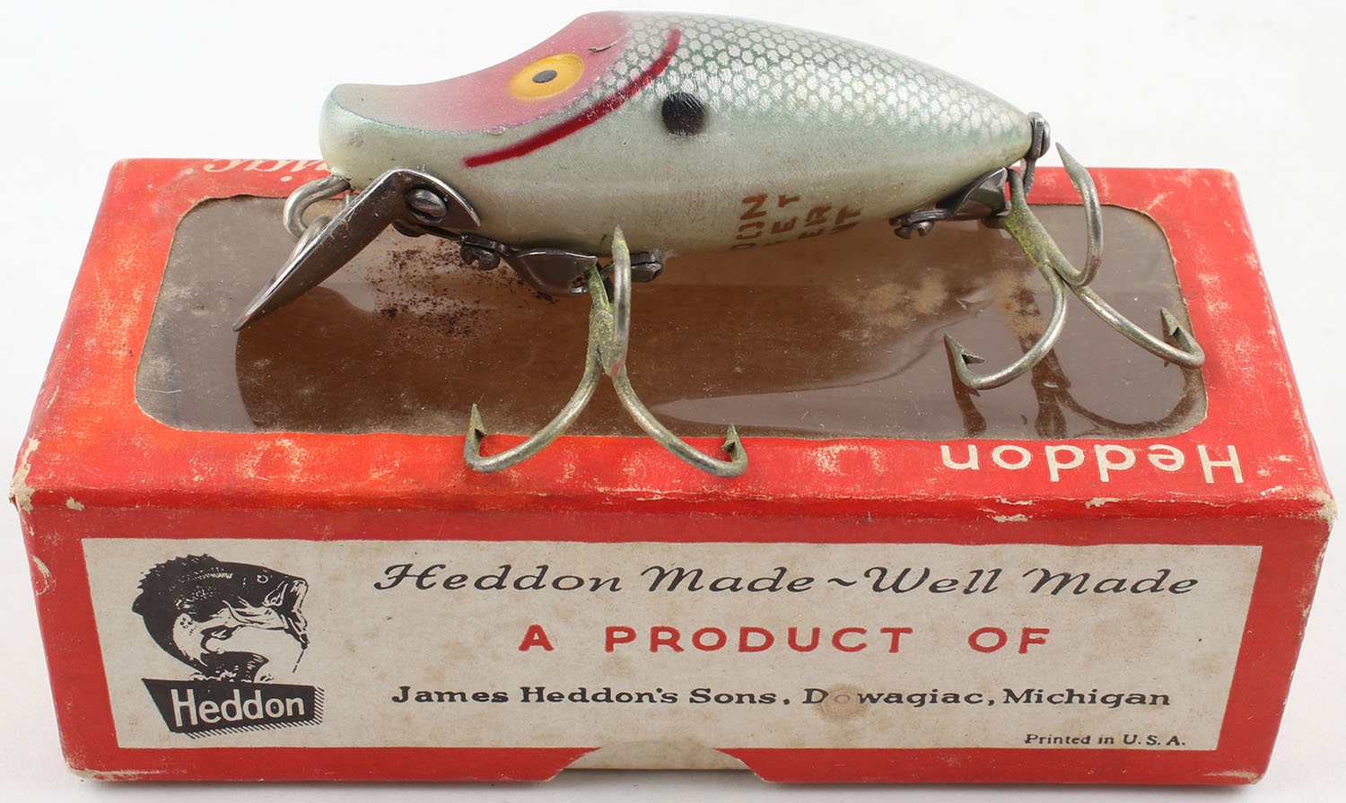 Heddon River Runt in the original box, PE, green scale, 2 hooks. Grade: Excellent - Value: 10 to 30