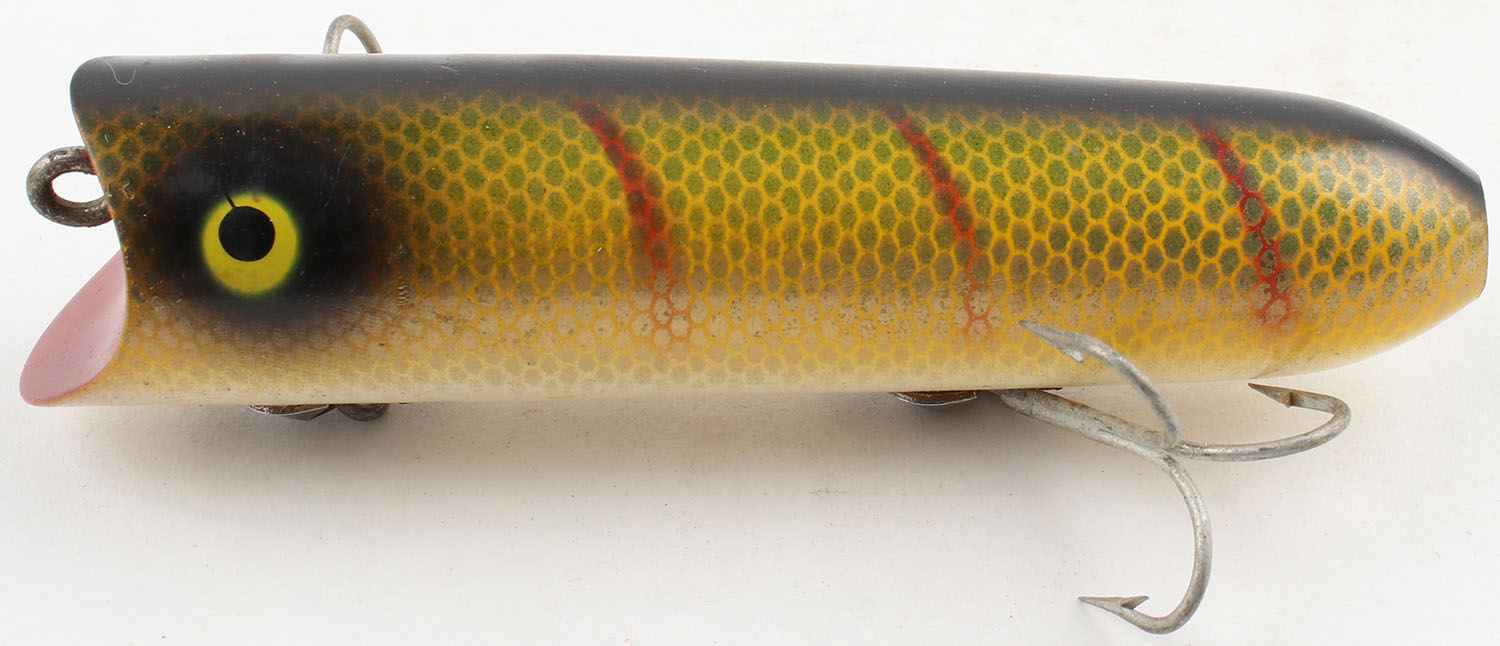 Heddon Lucky 13, wood lure, PE, green & yellow scales with black & red stripes, 2 hooks, marked on belly, 3 1/3'' OAL. Grade: Excellent - Value: 8 to 40