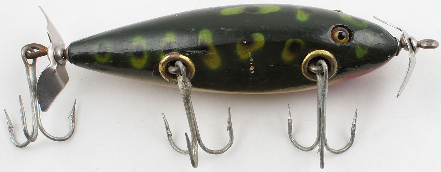 Vintage Creek Chub Injured Minnow, wood lure, GE, frog pattern, 3 hooks (2 on side), 2 spinners, light crazing, 4 3/4'' OAL. Grade: Very Good + - Value: 8 to 40