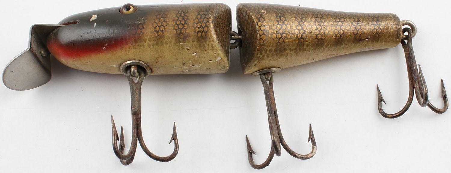 Creek Chub Pikie, jointed wood lure, GE, tan/green/red with gold scales, 3 hooks, fixed blade, marked on blade & top, some crazing on bottom. Grade: Very Good - Value: 8 to 40