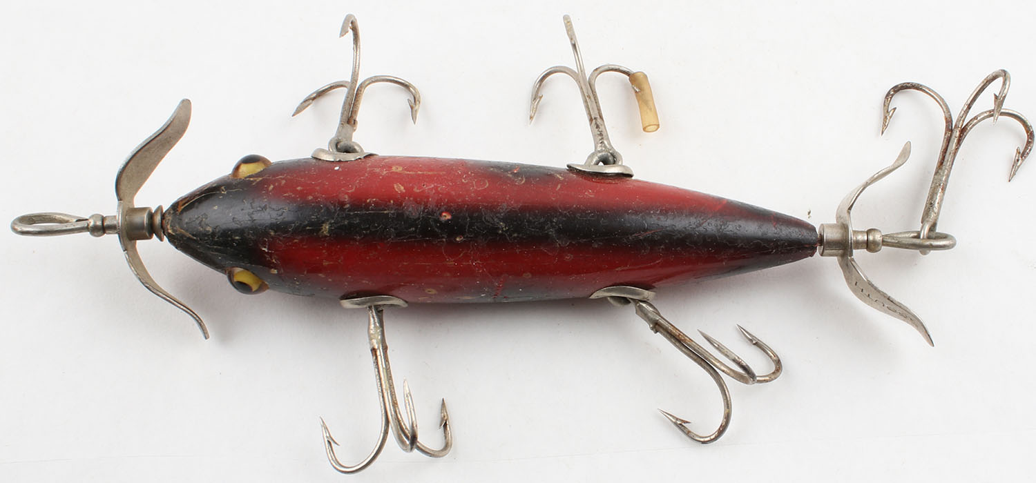 South Bend Surf Oreno, wood lure, GE, gold/red, 3 hooks, 2 spinners, marked on both spinners, crazing & light flaking to paint, 5'' OAL. Grade: Excellent - Value: 20 to 80