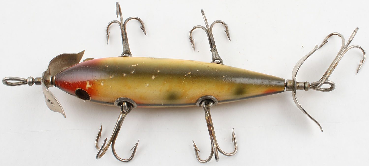 South Bend Crippled Minnow 5 Hook Lure, wood lure, GE, missing left eye, yellow/red/green, 5 hooks, 2 spinners, marked on spinners, light crazing, 5 1/2'' OAL. Grade: Very Good - Value: 50 to 250