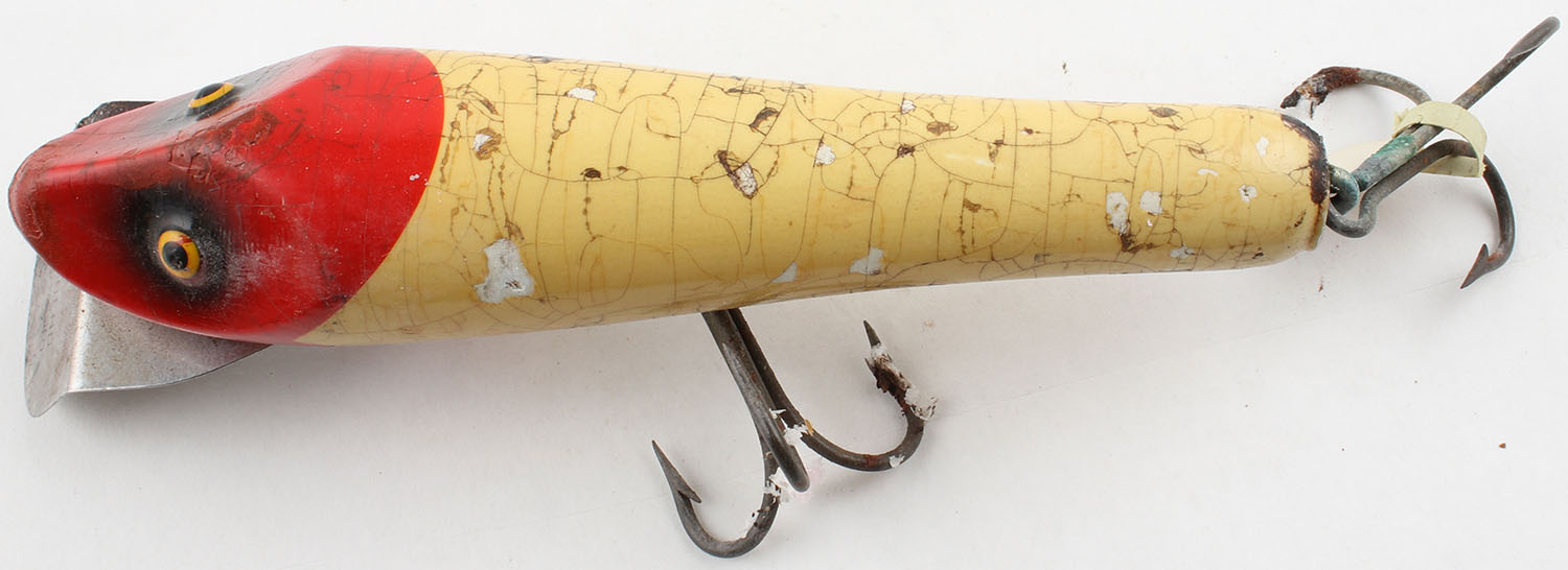 South Bend Pike-Oreno, wood lure, PE, cream & red, 2 hooks, fixed blade, marked on blade, crazing throughout, 5 1/2'' OAL. Grade: Fair ++ - Value: 6 to 20