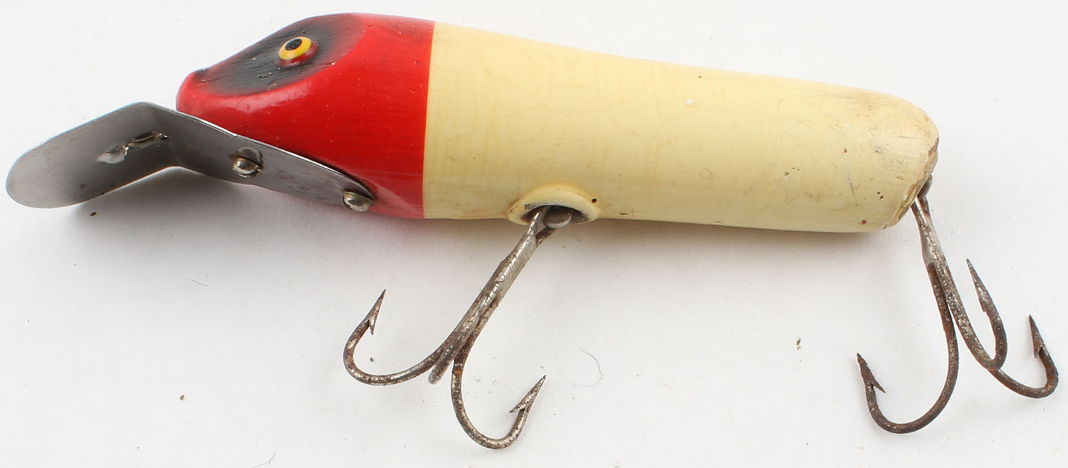 South Bend Pike-Oreno, wood lure, PE, cream & red, 2 hooks, fixed blade, marked on blade, light crazing, 4'' OAL. Grade: Very Good++ - Value: 8 to 40
