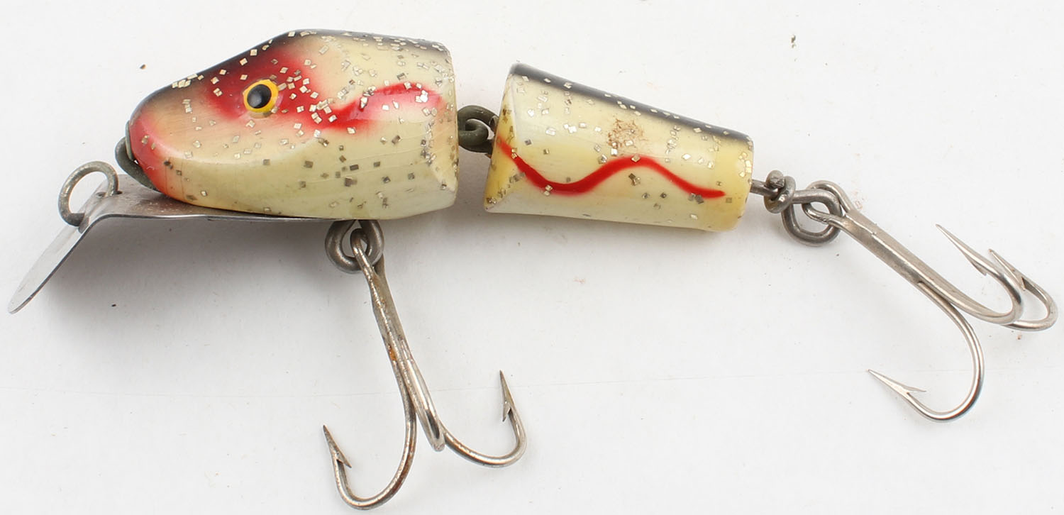 South Bend Pike-Oreno, jointed wood lure, PE, cream/red/black with sparkles, 2 hooks, fixed blade, marked on blade flat, light crazing, 4'' OAL. Grade: Excellent - Value: 8 to 40