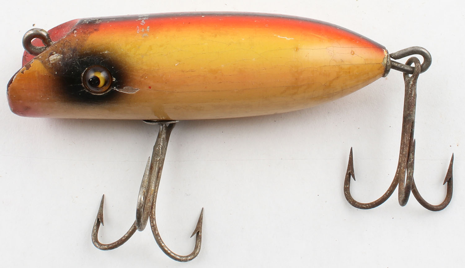 South Bend Babe-Oreno, GE, yellow/red/black, 2 hooks, faintly marked on back, light crazing throughout, 3'' OAL. Grade: Very Good ++ - Value: 6 to 30