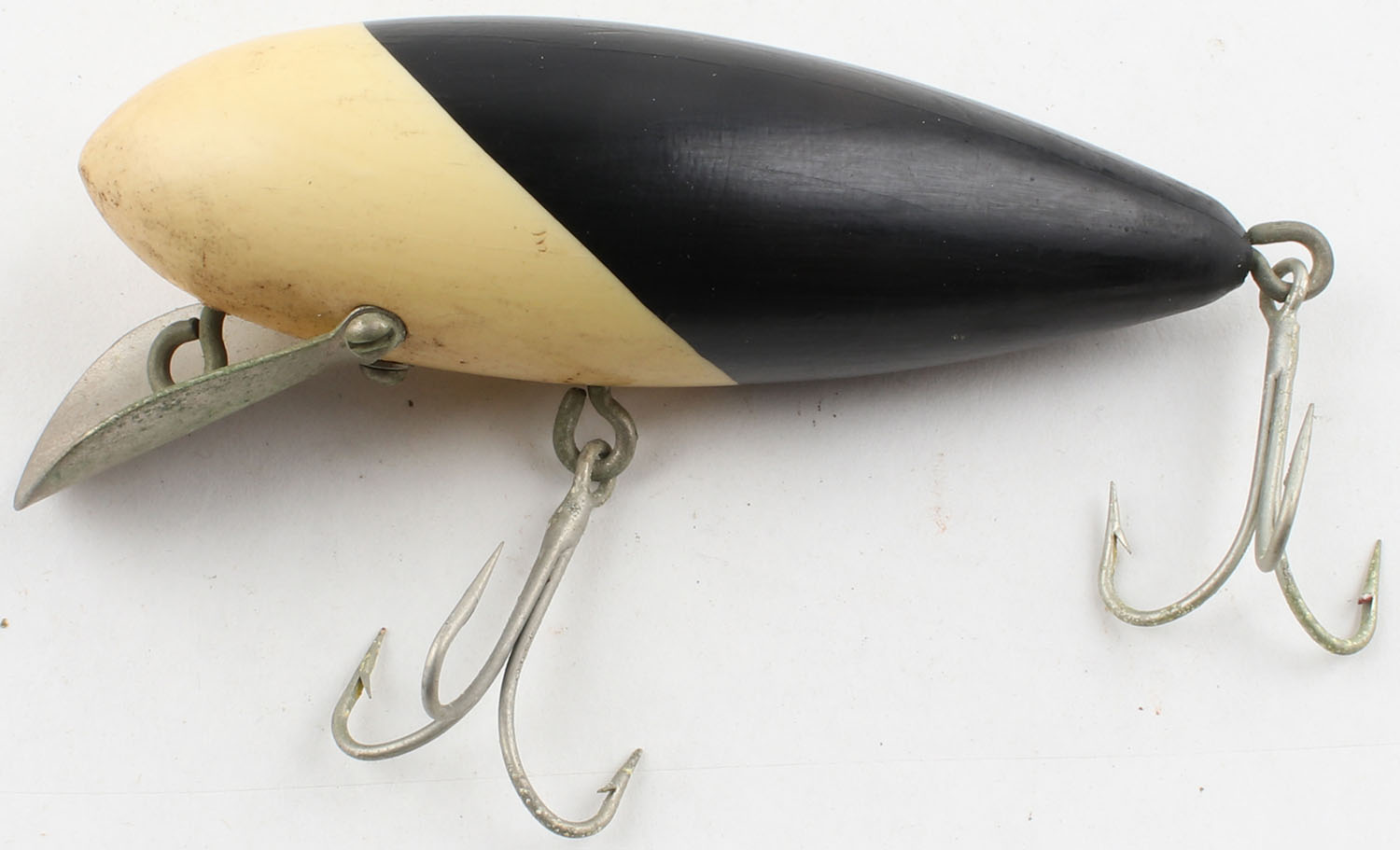 Vintage Pelican Fishing Lure by International Tackle Co., wood lure, cream & black, 2 hooks, fixed blade, unmarked, light crazing, 3 1/2'' OAL. Grade: Excellent - Value: 20 to 80