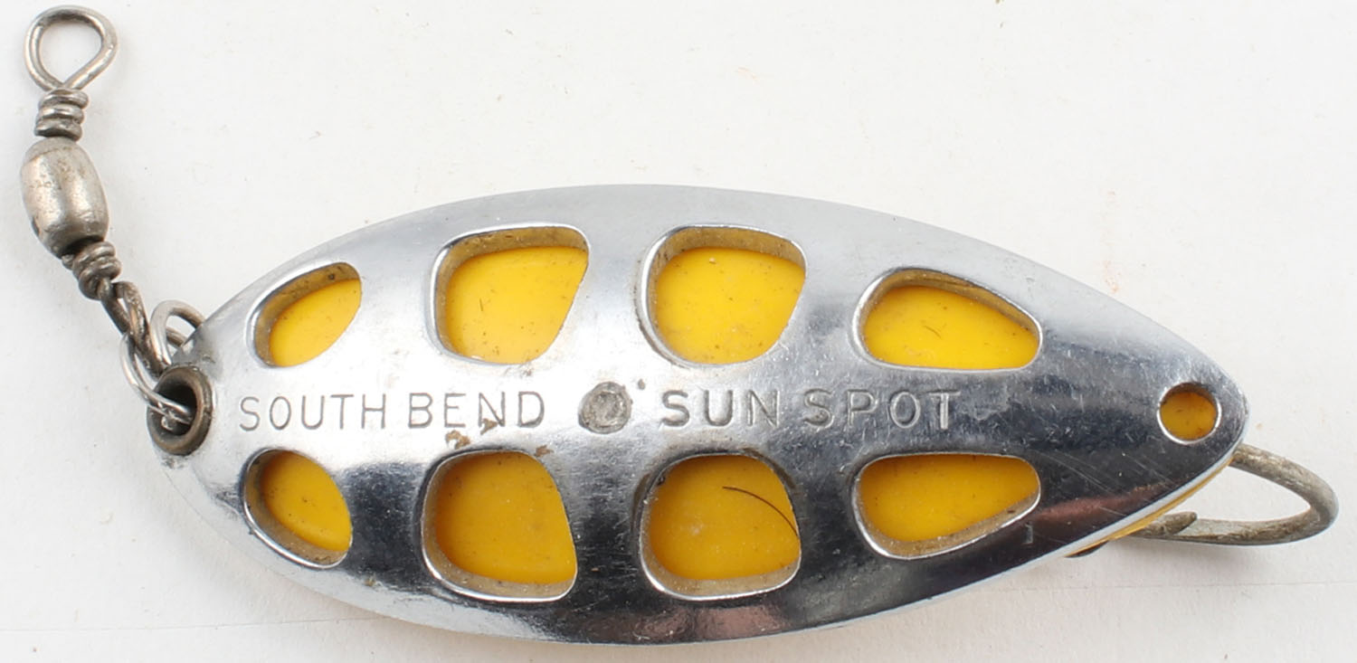 South Bend Sun Spot, metal lure, silver/yellow, single hook, marked on back, weed guard. Grade: Very Good + - Value: 8 to 30