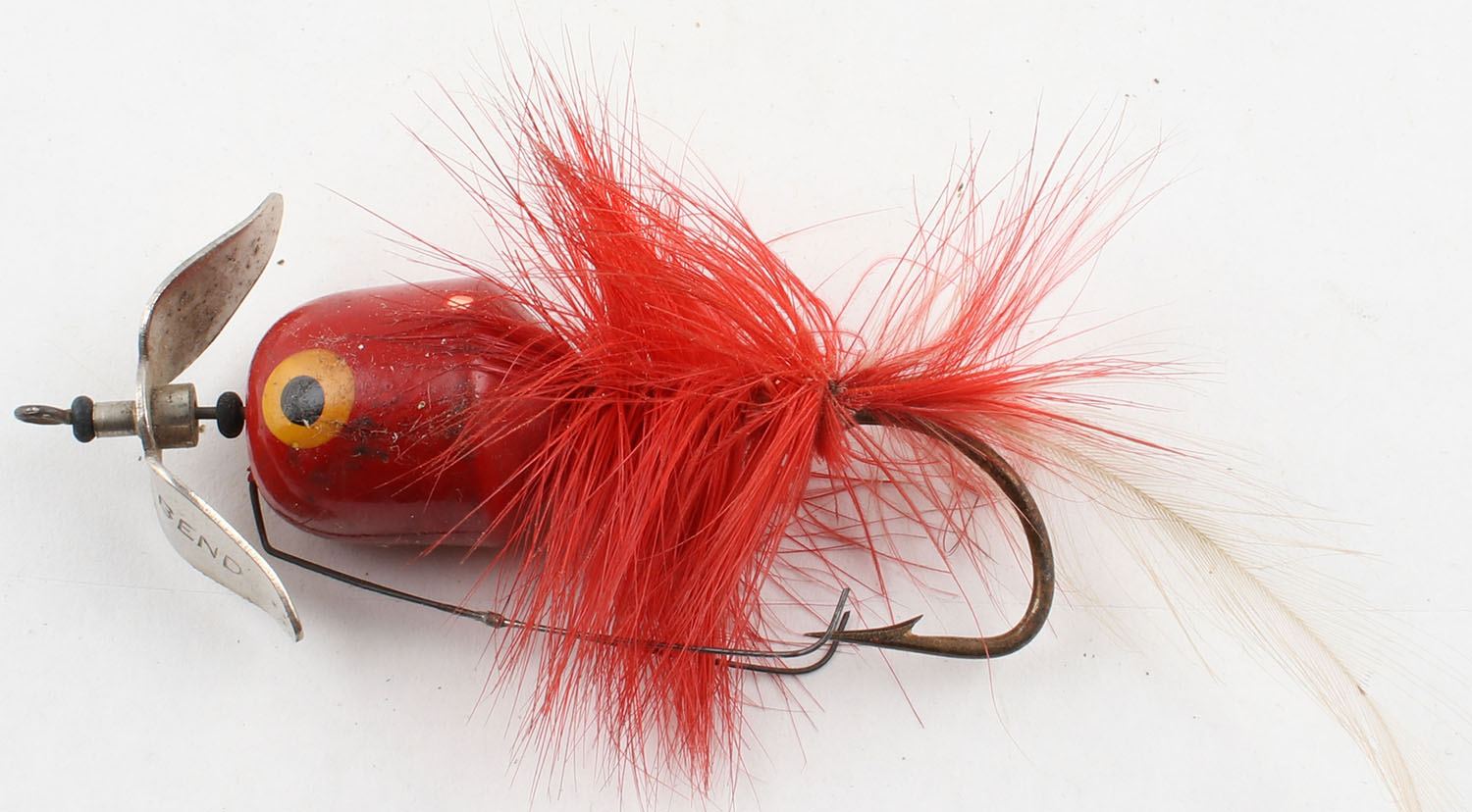 South Bend Strike-Oreno, wood lure, PE, red lure with red/white feathers, single hook, marked on spinning blade, two prong weed guard, crazing & paint chips, 4 1/2'' OAL. Grade: Good + - Value: 8 to 30