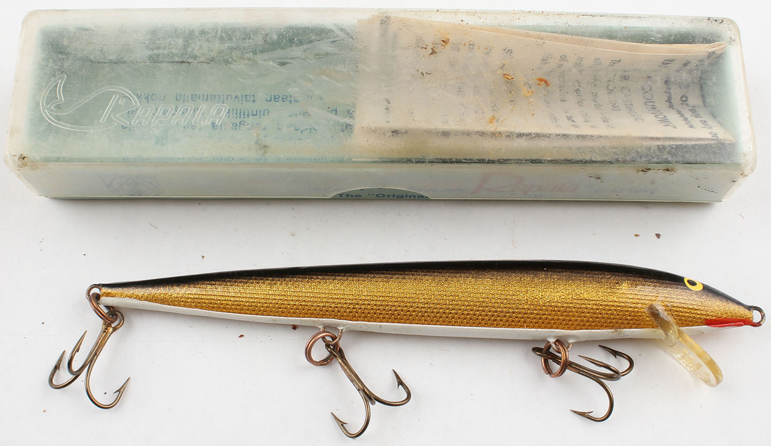 BOXED, Rapala ''Original'' Floating Model (Finland), wood lure, PE, white/gold/black, 3 hooks, transparent blade, comes in original box, 5'' OAL. Grade: Excellent ++ - Value: 10 to 40