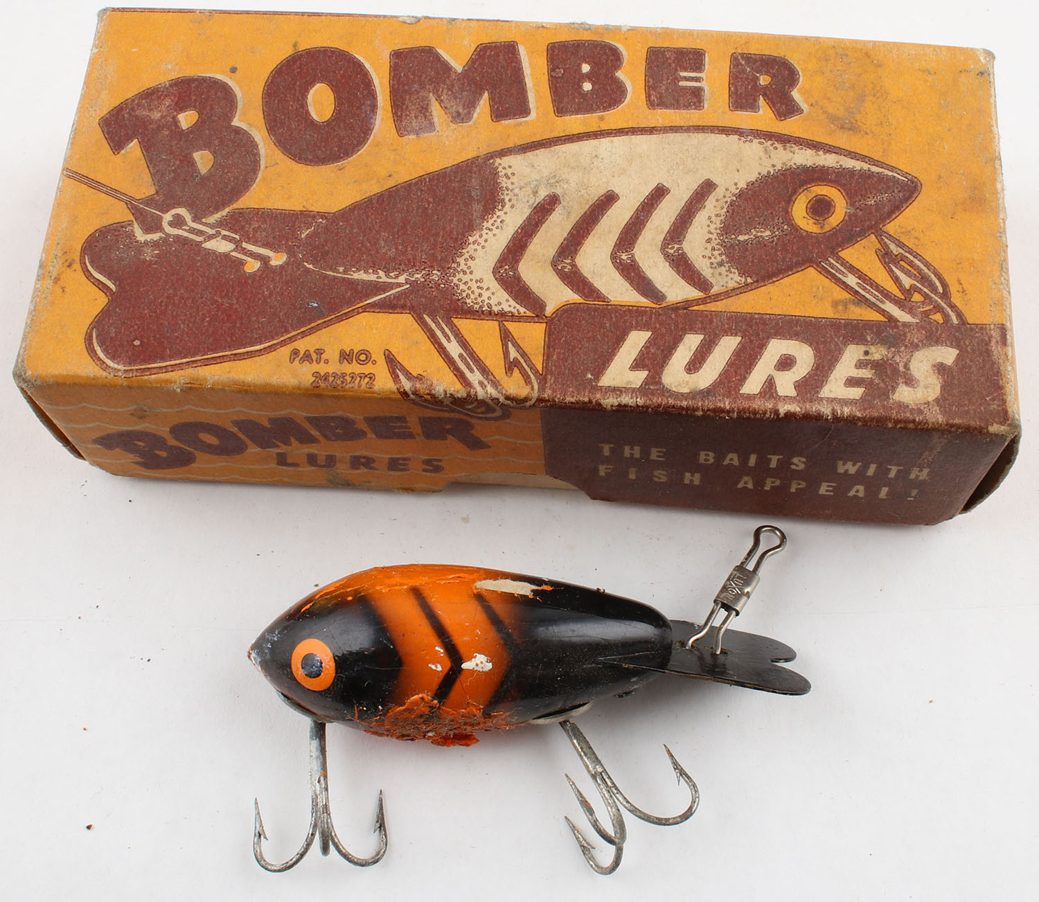 BOXED, Bomber Bait Co., Bomber No. 305, wood lure, PE, black/orange/red with black stripes, added paint, 2 hooks, rear blade, crazing to original paint, comes in original box with paperwork, 2 3/4'' OAL. Grade: Good - Value: 6 to 20
