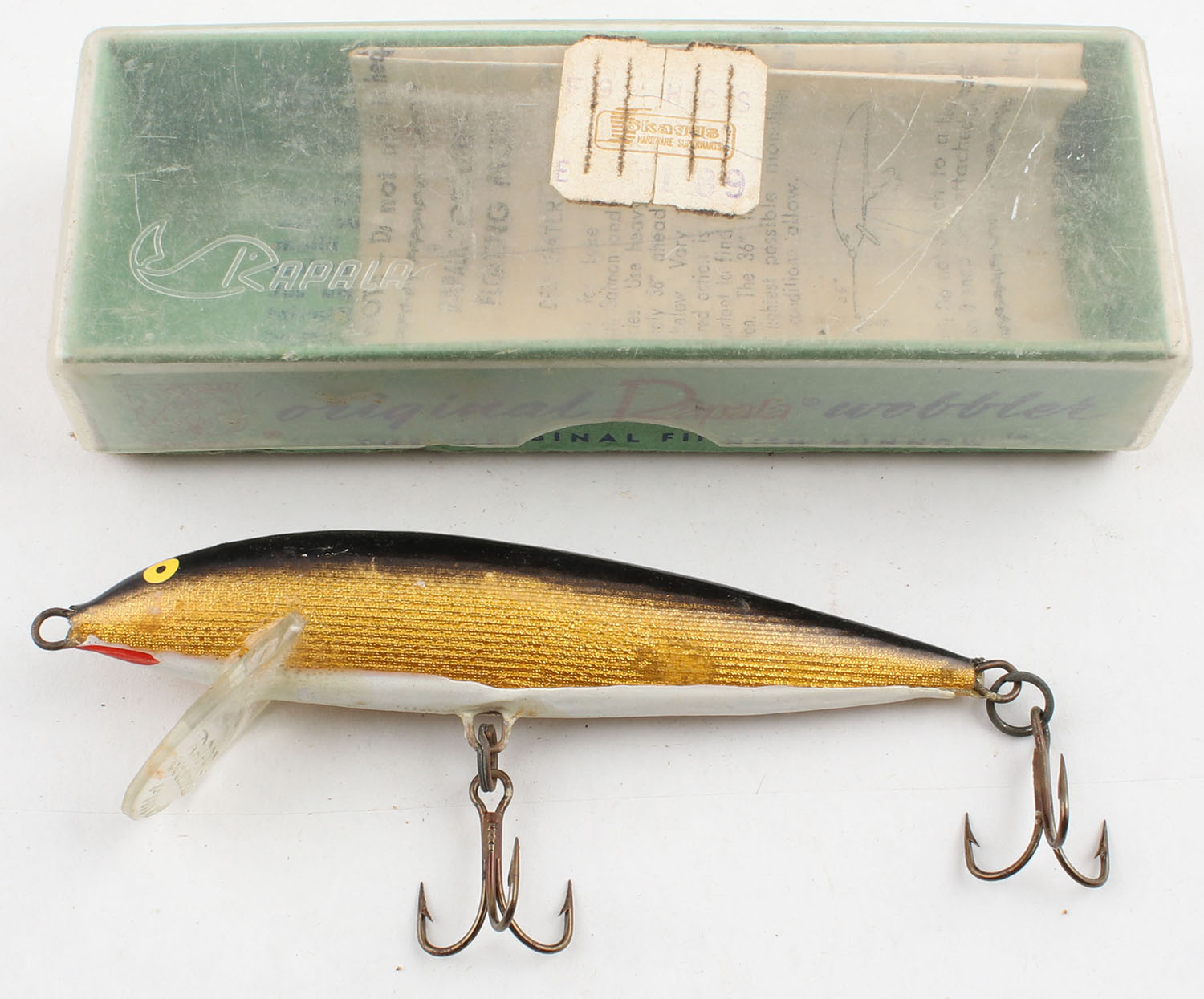 BOXED, Rapala Original Wobbler (Finland), wood lure, PE, white/gold/black, 2 hooks, transparent blade, comes in original box with paperwork, 3'' OAL. Grade: Excellent ++ - Value: 10 to 40