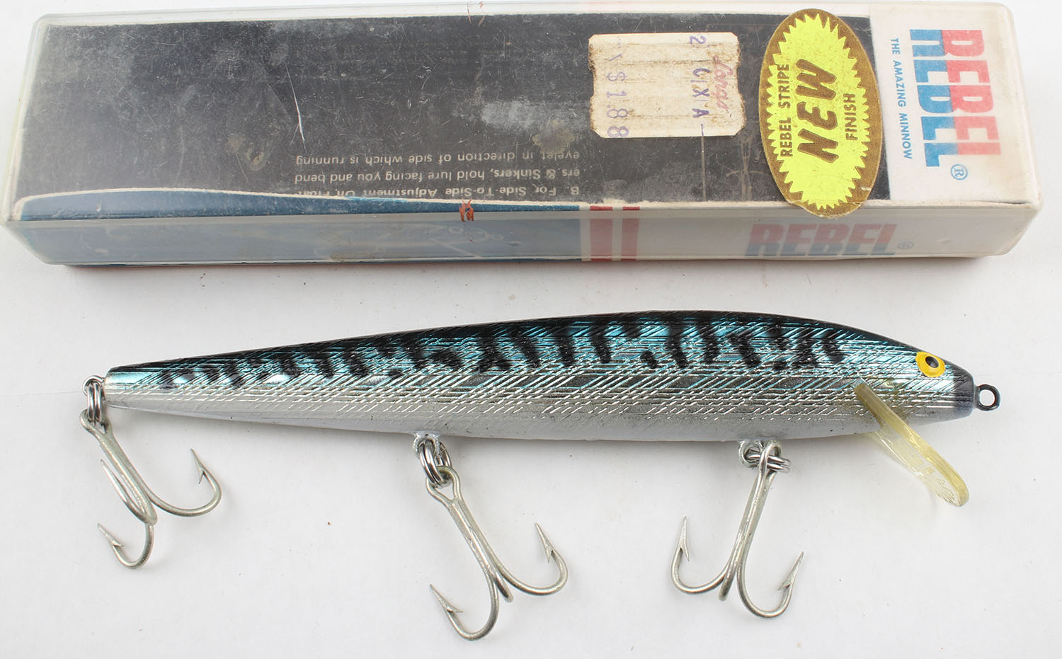 BOXED, Rebel The Amazing Minnow No. F-313 Blue, plastic lure, PE, white/silver/blue/black, 2 hooks, transparent blade, comes in original box, 5 1/2'' OAL. Grade: MINT - Value: 4 to 40