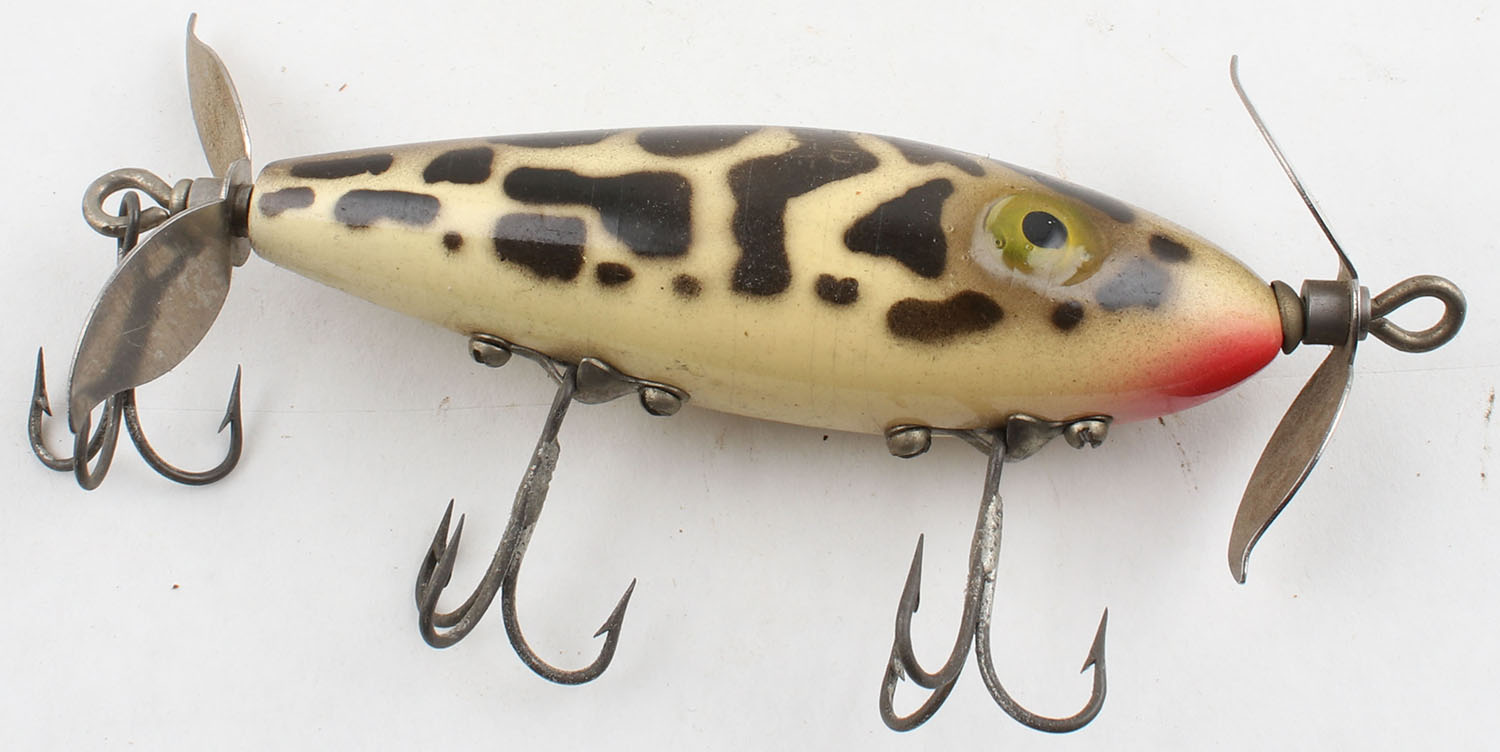 South Bend Nip-I-Diddee, wood lure, PE, cream & red with brown stripe & black spots, 3 hooks, 2 spinning blades, marked on back, light crazing, 4'' OAL. Grade: Excellent - Value: 10 to 30