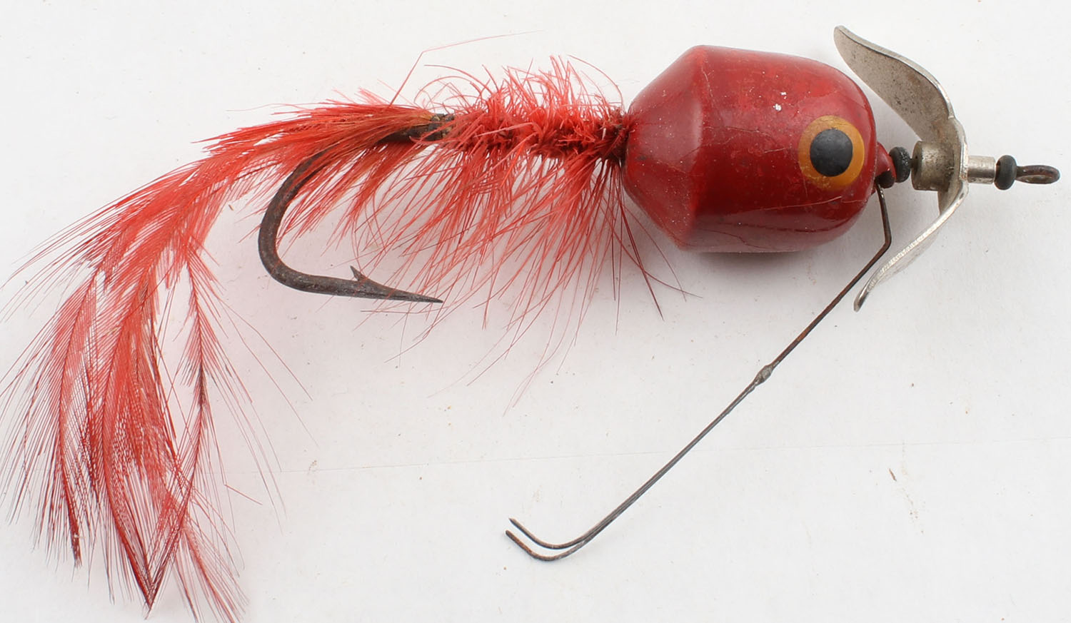 South Bend Strike-Oreno, wood lure, PE, red feathers, single hook, spinning blade, weed guard, unmarked, light crazing to paint, 3'' OAL. Grade: Good ++ - Value: 6 to 30