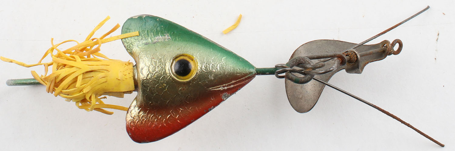 Fred Arbogast #2 Hawaiian, metal lure, PE, green/silver/red, single hook, spinning blade, weed guard, rubber skirt in tact, but frail, some small paint chips, 3'' OAL. Grade: Very Good - Value: 2 to 20