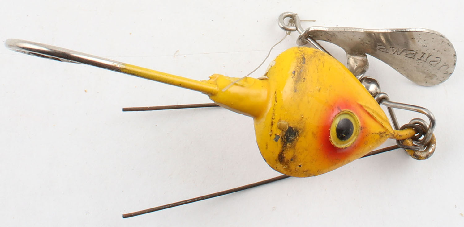Fred Arbogast Hawaiian Wiggler, metal lure, PE, yellow/red, single hook, spinning blade, weed guard, some wear from use, 2 3/4'' OAL. Grade: Very Good + - Value: 2 to 20