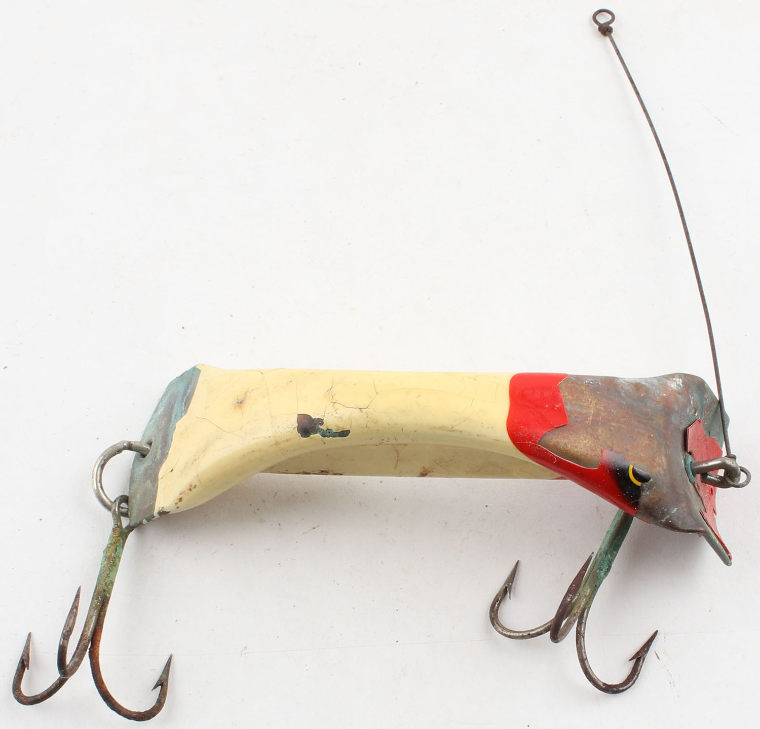 Unmarked, metal lure, PE, cream/red, 2 hooks, paint chipping, 3 1/4'' OAL. Grade: Fair ++ - Value: 2 to 20