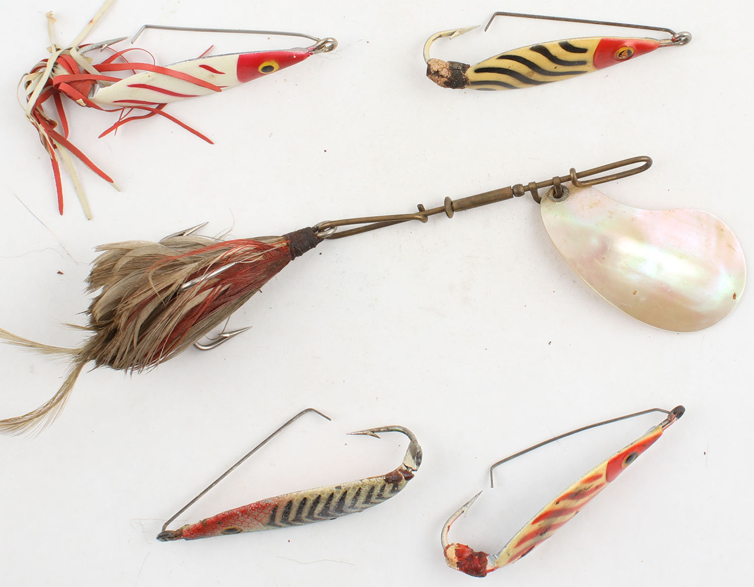 Lot of 5 Fishing Lures, (4) #3 Hawaiian & one pearl spinner with feathers. Grade: Good ++ - Value: 6 to 30