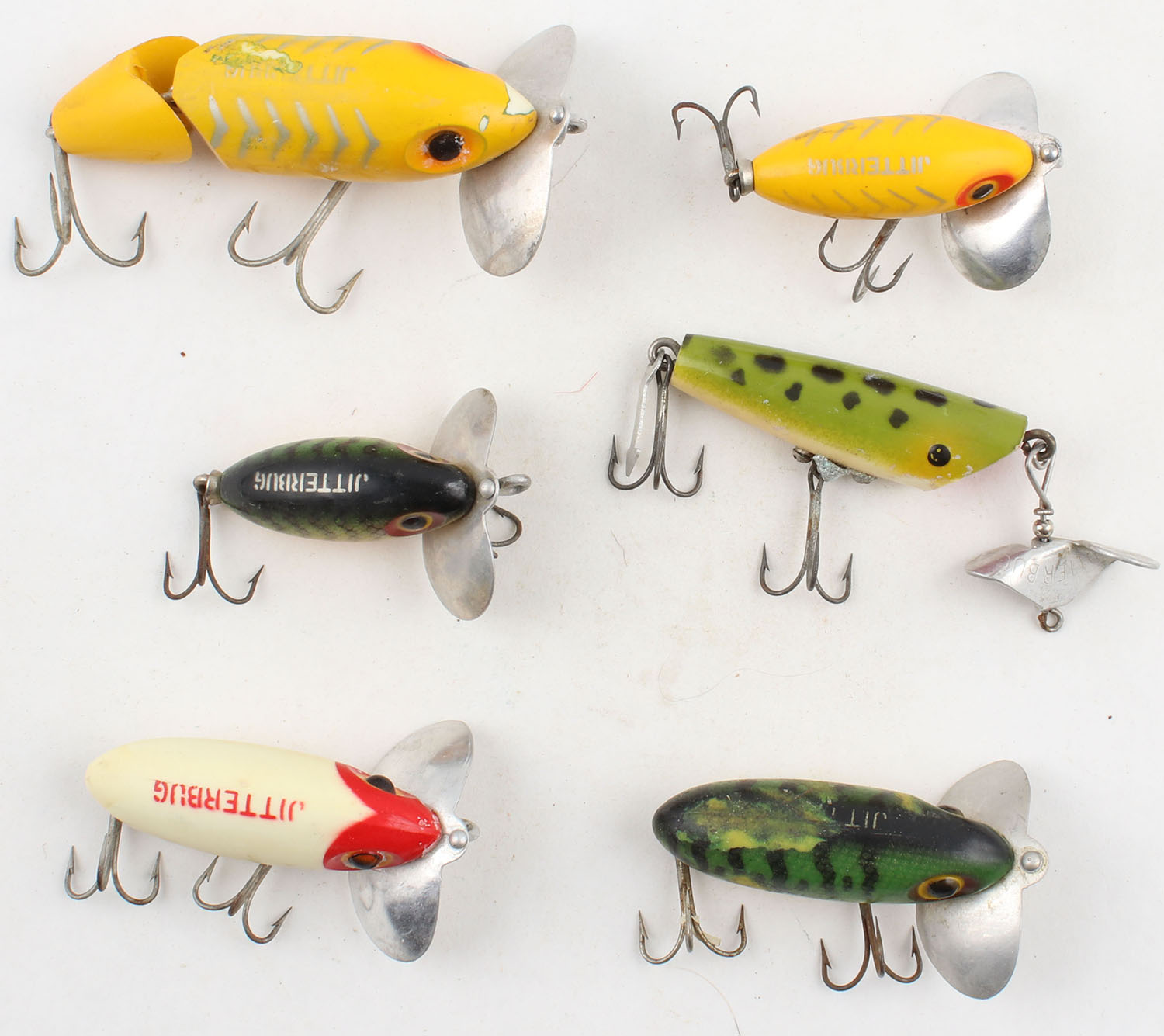Lot of 6 Fishing Lures, similar styles, different sizes & color patterns. Grade: Excellent - Value: 8 to 40