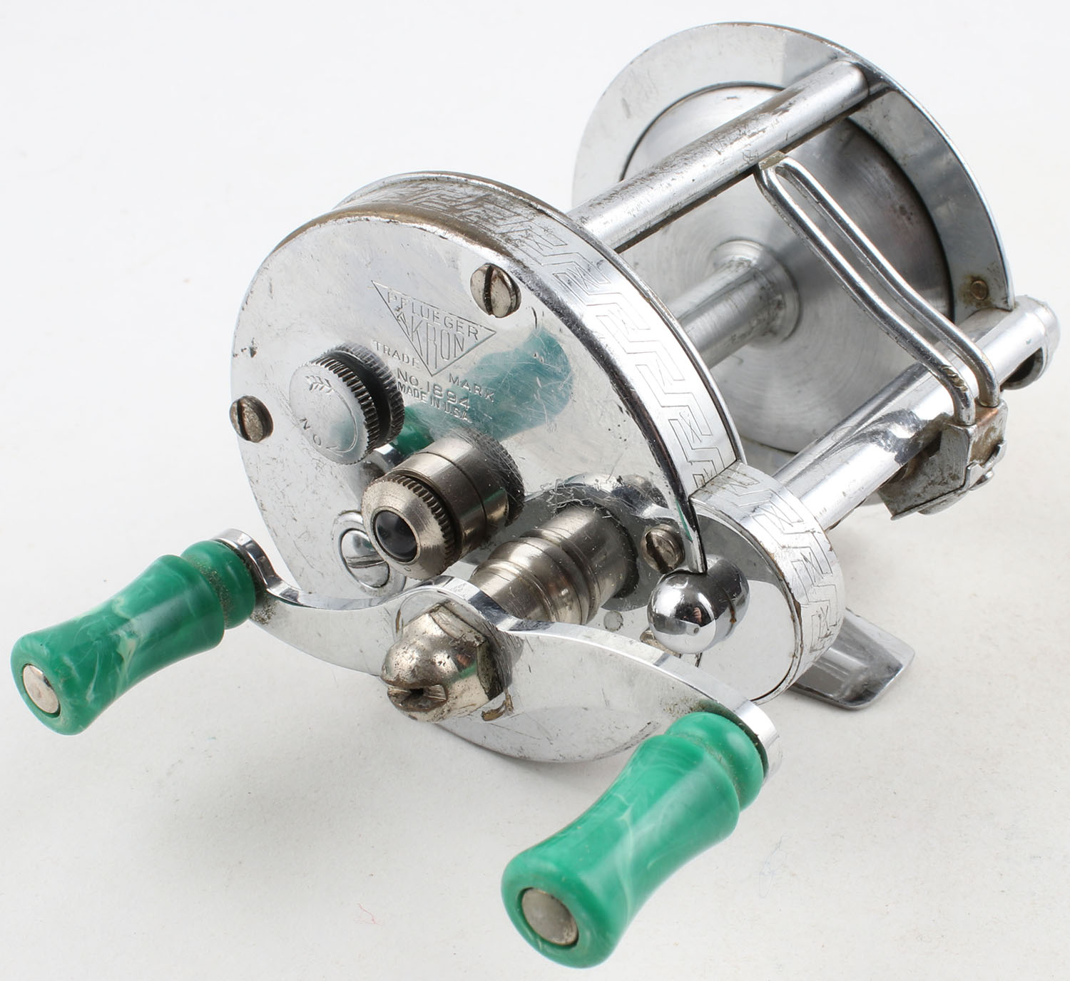Pflueger Akron No. 1894, no yardage mark, black JWL, dual handle, marked on both side plates, reel turn has tension & strong clicks. Grade: Very Good + - Value: 8 to 40