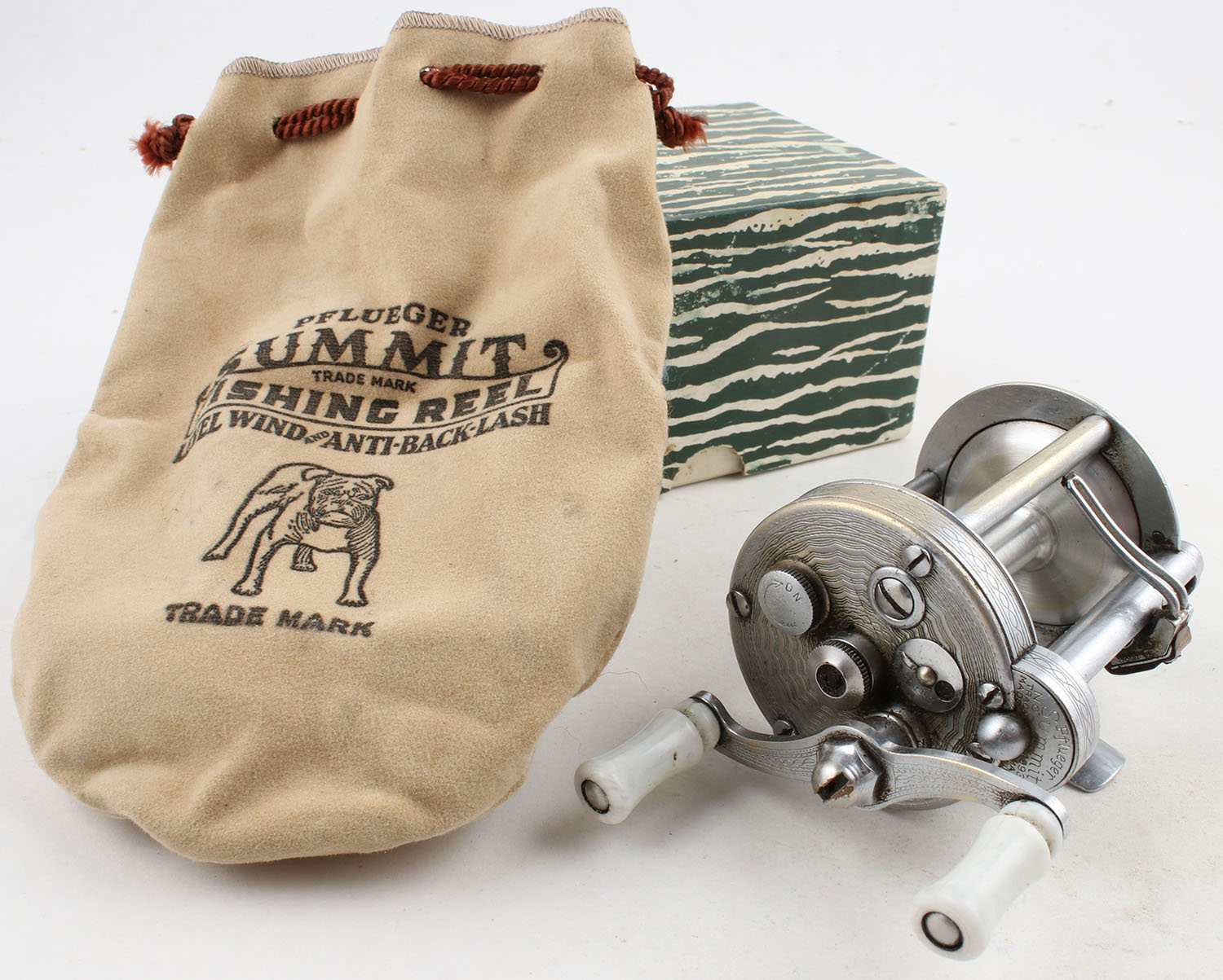 BOXED, Pflueger Summit No. 1993-L, no yardage mark, double handle, marked on small side plate, smooth turn, strong clicks, missing jeweled end cap, comes in Pflueger soft case & box, with took & paperwork. Grade: Very Good - Value: 10 to 50