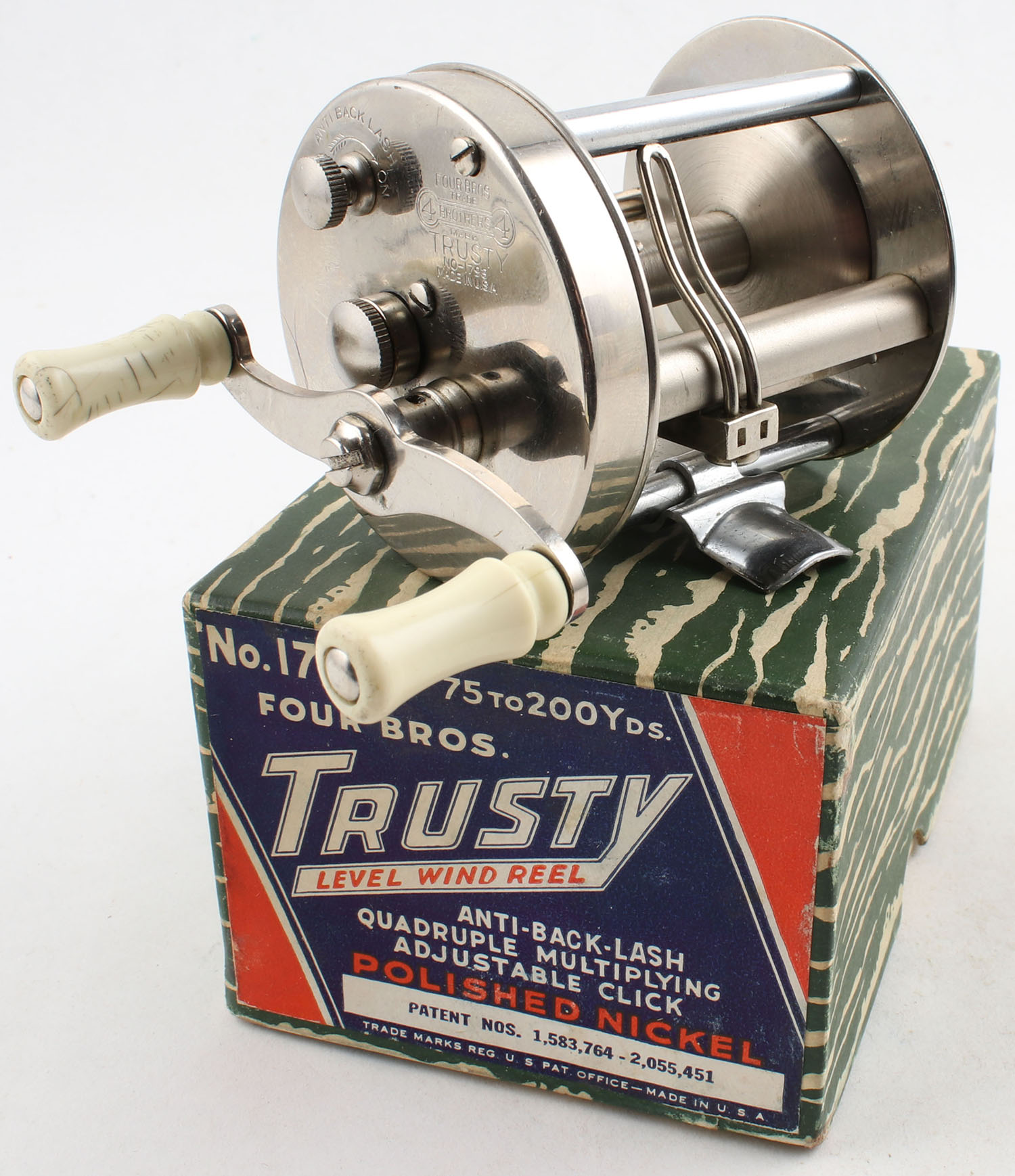 BOXED, Four Bros Trusty No 1793, 75 to 200 yds, dual handle, marked on side plate, smooth turn, clear clicks, comes with original box. Grade: Excellent - Value: 10 to 50