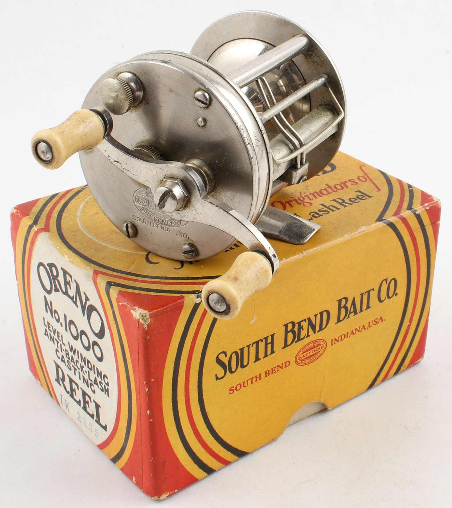 BOXED, South Bend Oreno No. 1000, no yardage mark, dual handle, red JWL, marked on both side plates, smooth turn & clear clicks, comes in original box. Grade: Very Good + - Value: 10 to 50