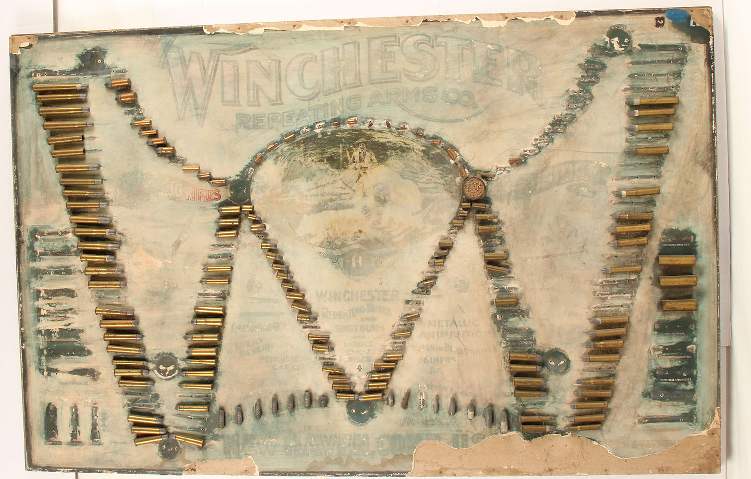 HISTORY: The Winchester Repeating Arms Company was founded by Oliver Winchester, who acquired the rights to the Volcanic Repeating Arms Co. from Smith & Wesson, producing some of the earliest & certainly most famous repeating cartridge rifles. The company would go on to dominate firearm manufacturing, innovation and were also competitive in the ammunition industry. Winchester was quite skilled at marketing both their firearms & ammunition. Part of their marketing efforts were these impressive display boards, such as this one. Over the years they displayed the evolution of metallic cartridges from rimfire to centerfire and black powder to smokeless powder. The company produced six different patterns of commercial bullet boards from 1874 to 1897. ''Please hang in a prominent place''. That's the request on the back of a Winchester cartridge display board.