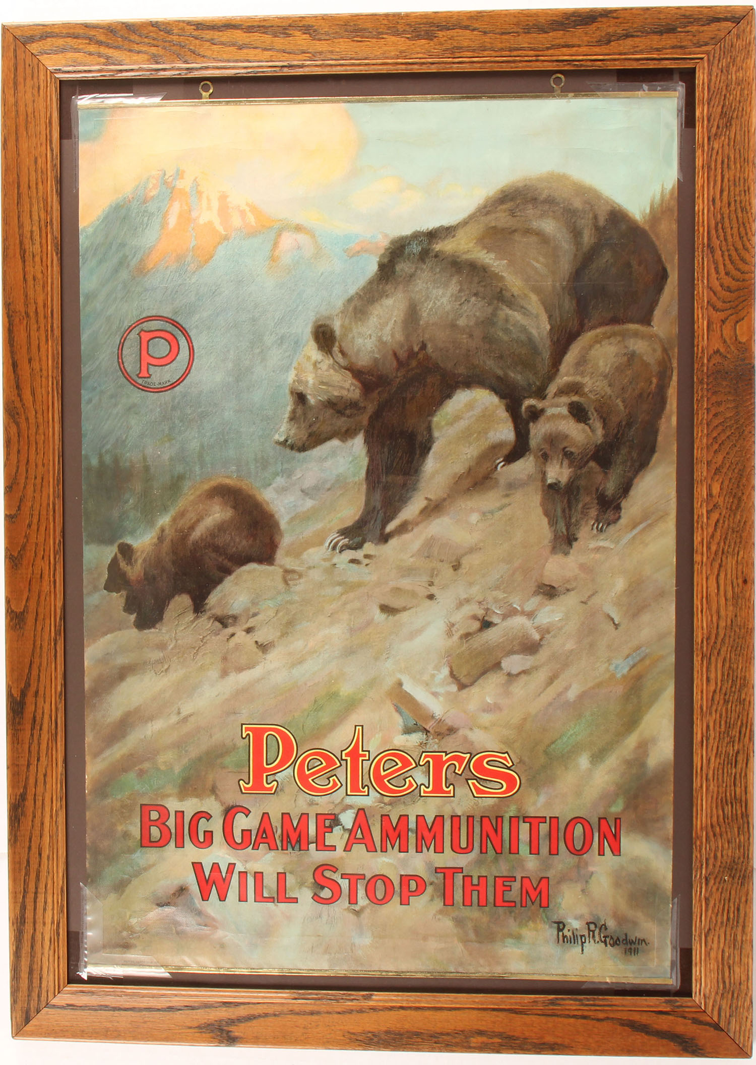 1911 Peters Poster ''BIG GAME AMMUNITION WILL STOP THEM'', by Philip R Goodwin, the original example was trimmed 1'' on either side, then fully restored to the proper size with added materials, has full color image of Grizzly Bear & two cubs with mountain scene background, has metal bands on top and bottom with two brass hangers on top, has great colors with professional touch ups throughout, framed. 20 3/8'' x 30 1/4''. HARD TO FIND IMAGE. Grade: Very Good++ - Value: 4000 to 8000