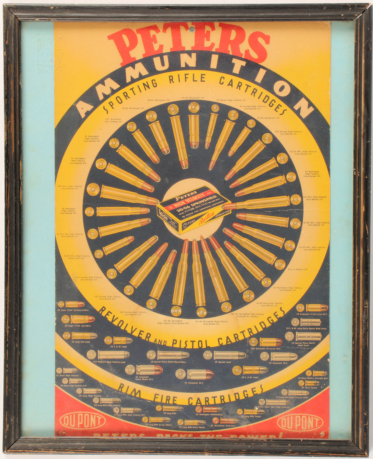 Peters Ammunition Sporting Rifle Cartridges Diecut, pictures a variety of Peters cartridges with ammo box in the center, target shaped diecut, has metal gromet insert for hanging, great colors, a few light creases & minor edge wear, tack holes in bottom corners, 13'' x 20''. Grade: Excellent - Value: 100 to 200