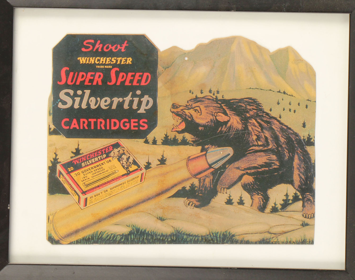 Winchester Super Speed Silvertip Cartridges Diecut, vintage reproduction, pictures a multi-color image of a bear in a mountain setting, an oversized 30-06 cartridge & Silvertip cartridge box, nice colors, little to no wear, framed, 10'' x 8''. Grade: Excellent - Value: 10 to 100