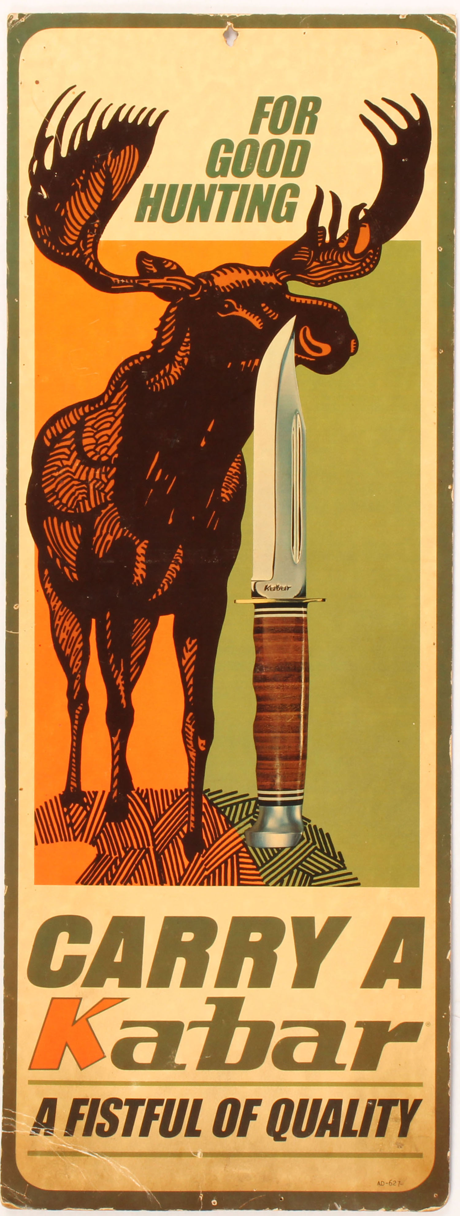 Kabar Knives Two-Sided Hanging Sign, one side pictures a blue fish, with an open Kabar folding knife, displaying the two styles of blades, on the other side is a multicolor image of bull moose, with a Kabar fixed blade knife, some age soiling & staining to the bottom, edge & corner wear, one corner has a crease, 8 1/2'' x 22 1/2''. Grade: Good ++ - Value: 20 to 80