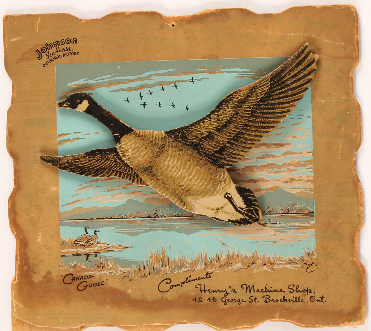 Johnson SeaHorse OutBoard Motors 3D Diecut ''CANADA GOOSE'' , ''COMPLIMENTS HENRY'S MACHINE SHOP'', pictures a multi-color image of a goose in flight, with a water & mountain backdrop, age soiling & staining, edge & corner wear, the bottom portion of the image is starting to peel away from the backing. 9'' x 8''. Grade: Good ++ - Value: 10 to 50