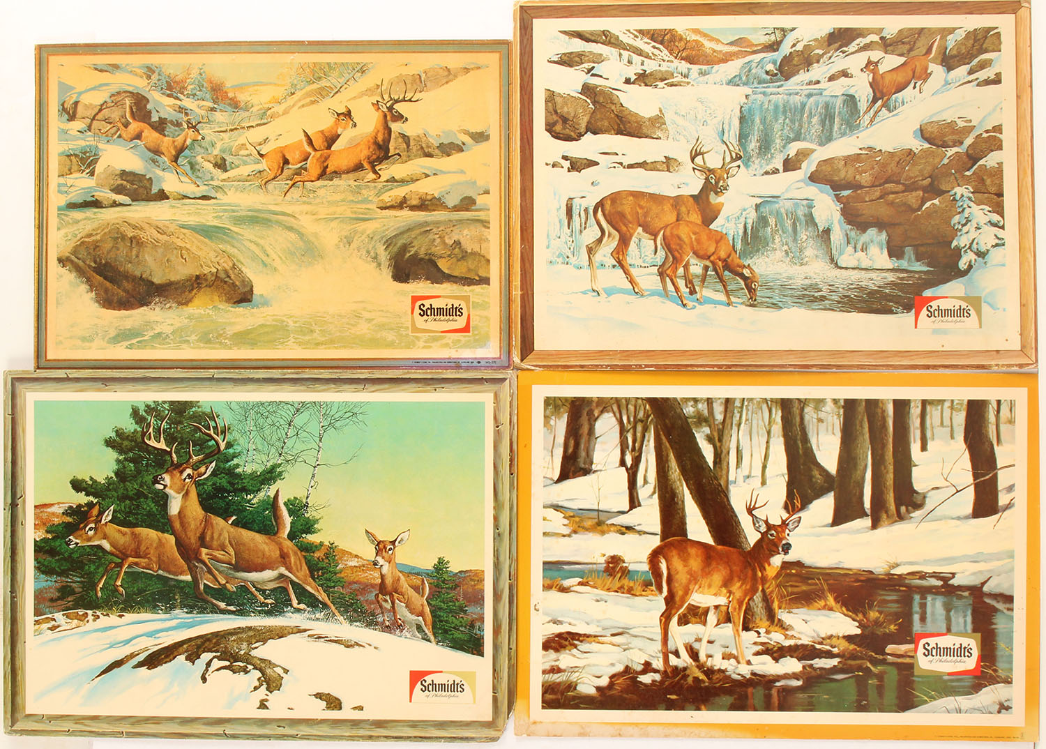 Lot of 4 - Schmidt's of Philadelphia Posters, made of diecut material, all different images of deer, some age soiling & staining to all, edge & corner wear, (3) are 22'' x 16'', (1) 20 1/2'' x 14 1/4''. Grade: Very Good - Value: 20 to 80